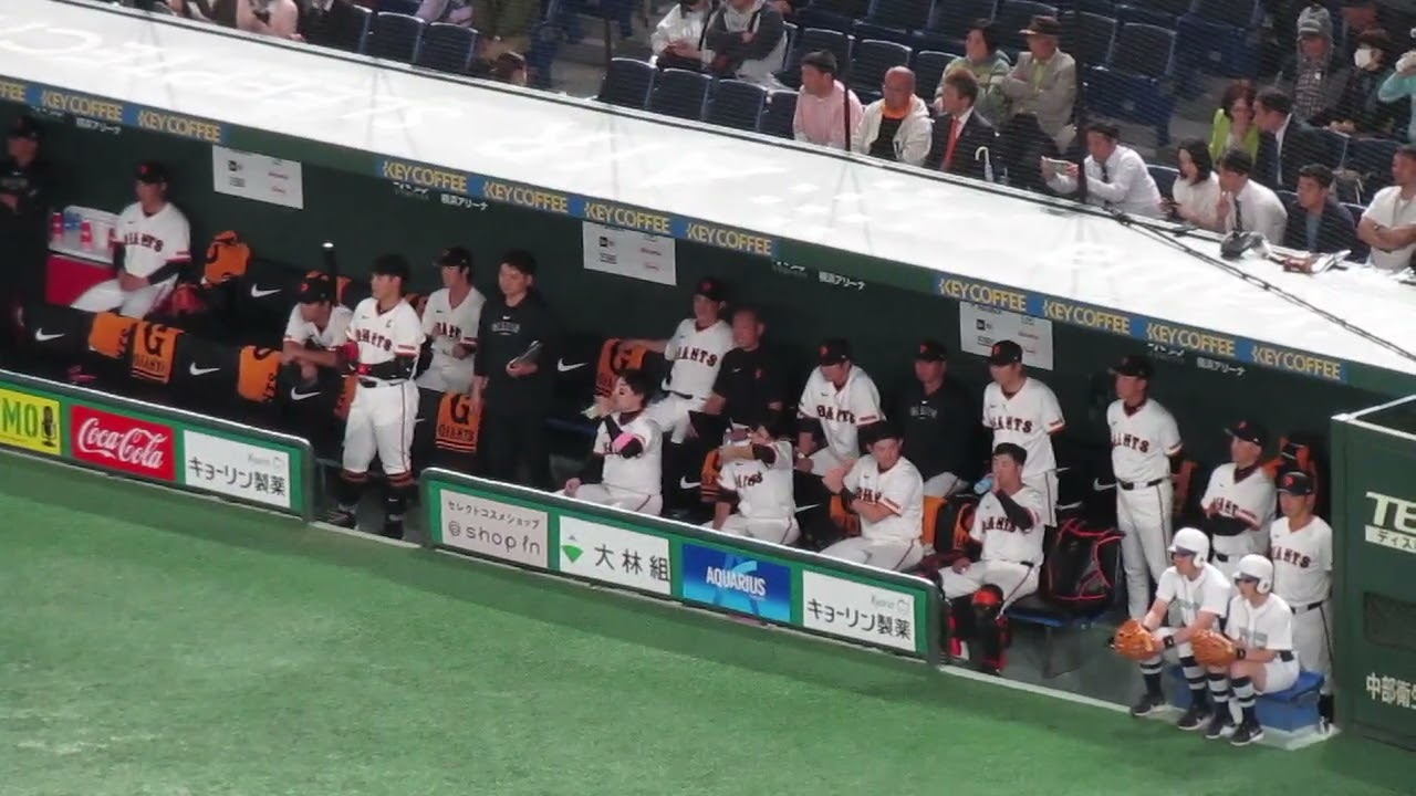 ベンチで涌井秀章にタイミング合わす岡本和真など(読売ジャイアンツ対 中日ドラゴンズ2024年4月24日)