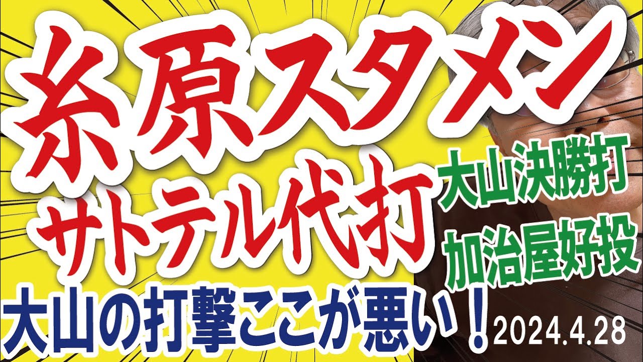 2024.4.28 神4-3ヤ T強い!2連勝・4カード連続勝越し・貯金5、スタメン糸原活躍・3安打1打点、大山ラッキー決勝打、加治屋好投・2イニング0安打、ダブルストッパー/クローザー(岩崎・ゲラ)