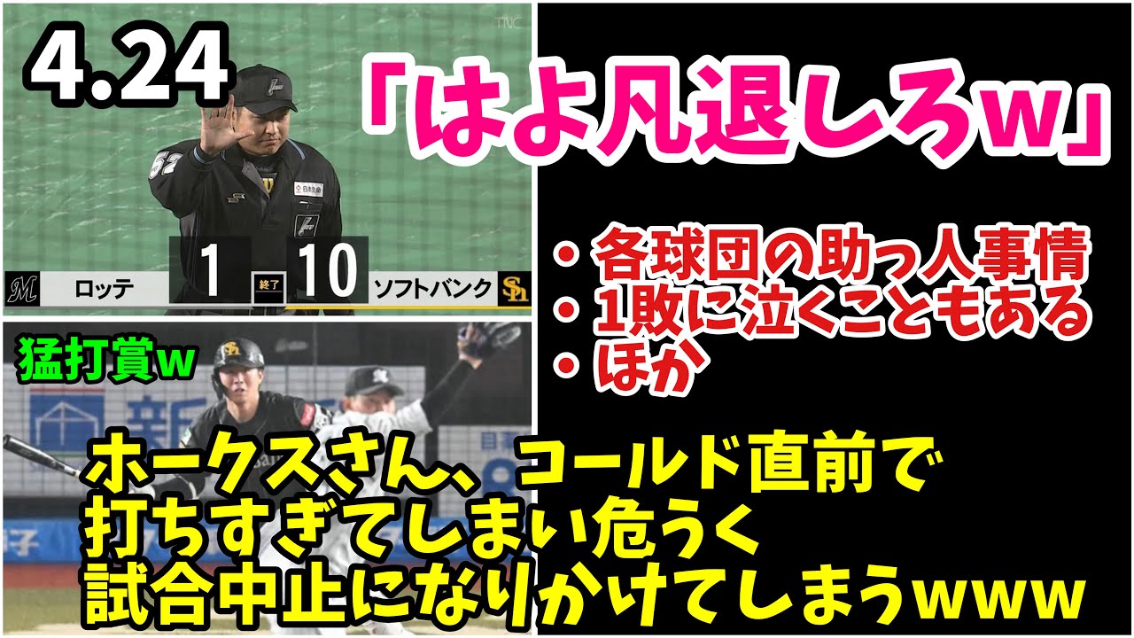 雨天中止に怯えながら感情が複雑になるホークスファンさんたちの反応が面白すぎた件w 2024年4月24日 福岡ソフトバンク対千葉ロッテ 試合ハイライト