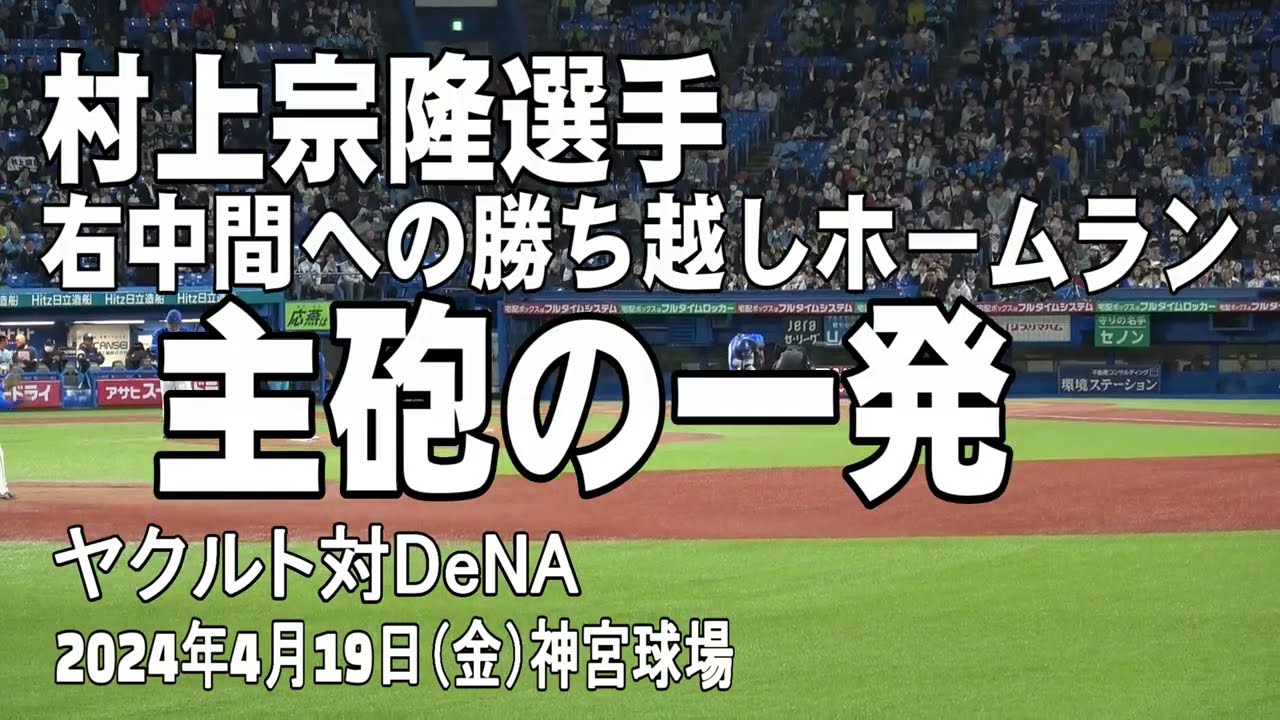 【球場の空気を変えるホームラン】村上宗隆選手3号 2024年4月19日(金)神宮球場 ヤクルト対DeNA 8回裏 ヤクルトの攻撃 マウンドには伊勢投手が上がる 4番村上選手 1球目 外角低めフォーク132km/h見逃し カウント0-1 2球目 真ん中やや高めストレート148km/h空振り カウント0-2 3球目 外角高めストレート 打球は右中間スタンド中段へ飛び込む ヤ4-3De Tokyo Yakult Swallows村上宗隆東京ヤクルトスワローズ NPBHUB.COM | The Fanbase of Nippon Baseball & Nippon Professional Baseball