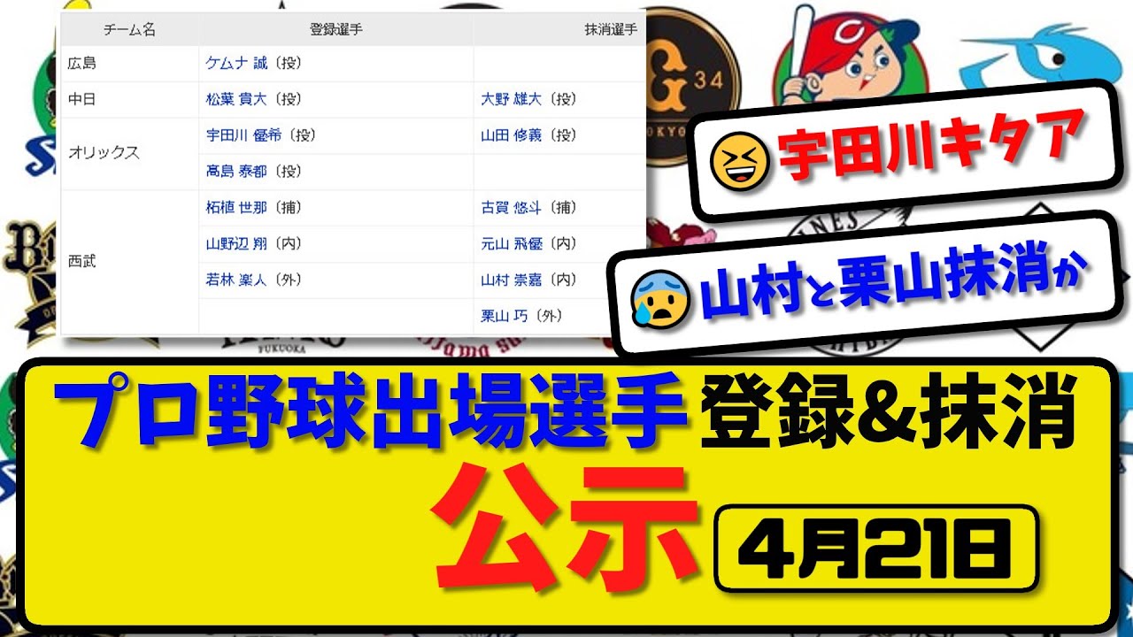 【公示】プロ野球 出場選手登録&抹消 公示4月21日発表|中日大野 オリ山田 西武古賀&山村&栗山ら抹消|広島ケムナ オリ宇田川&高島 西武柘植&山野辺&若林ら登録【最新・まとめ・反応集・2ch】