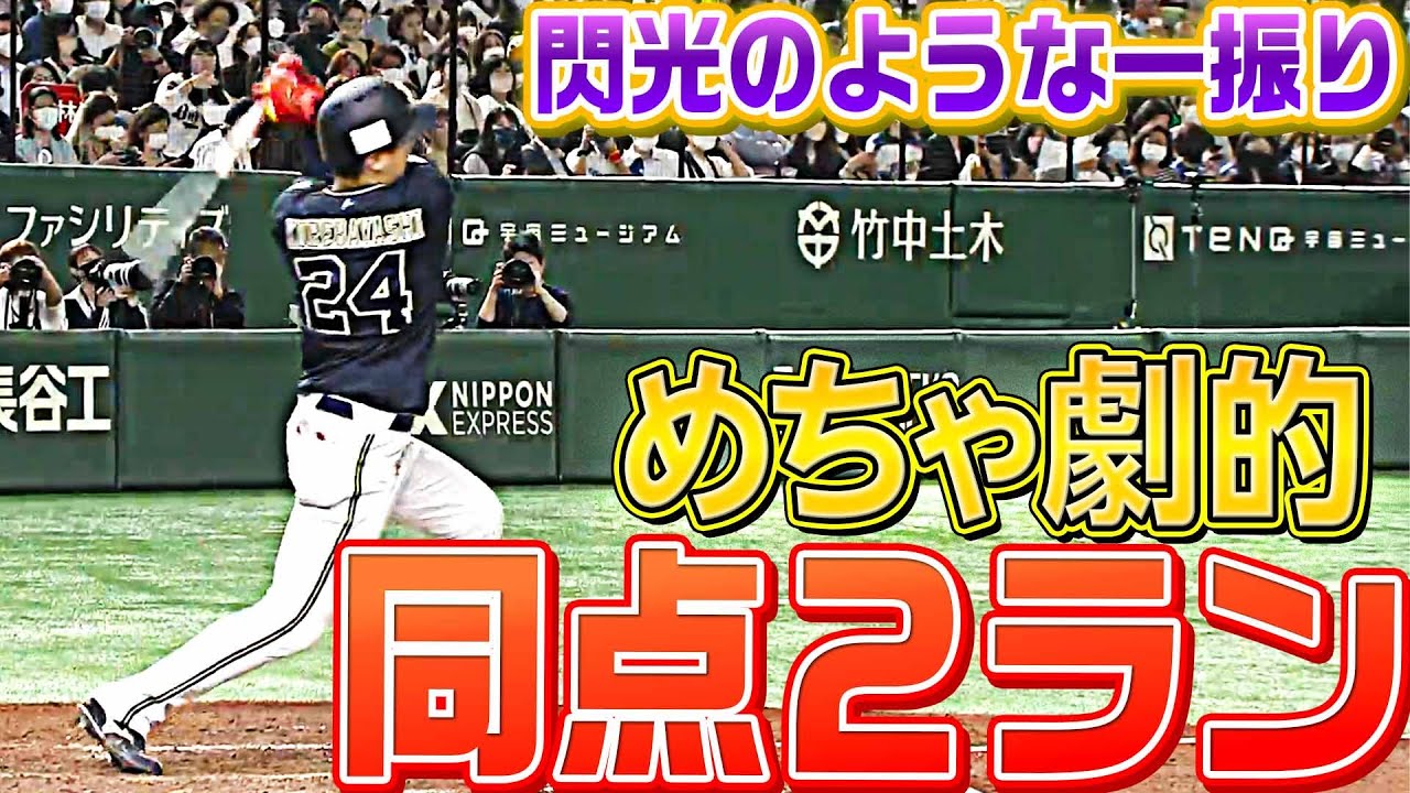 バットの先で捉えているように見えるが、閃光のような鋭いスイングで打球を捉え、レフトスタンドに突き刺す今季1号!! オリックス・紅林弘太郎の一発で試合は振り出しに!!