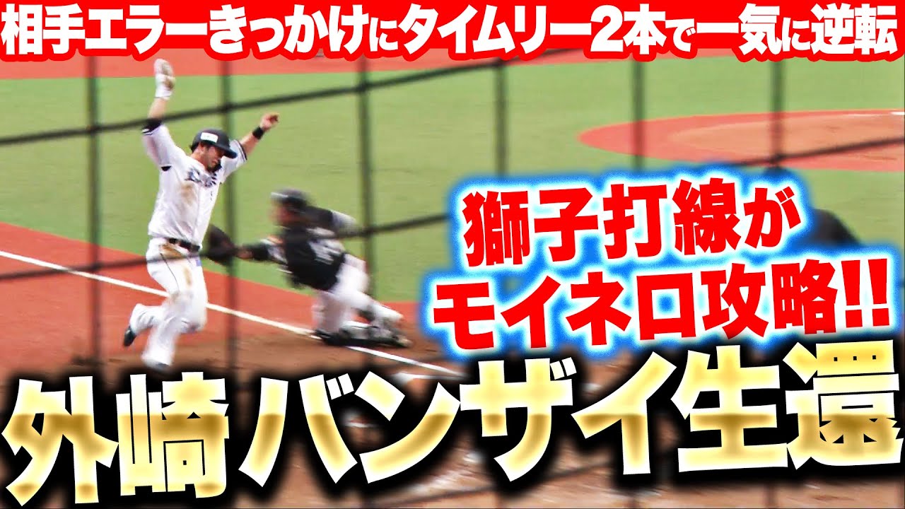 誰もが”パテレ行き”を確信したであろう、この同点のシーン。埼玉西武・外崎修汰が相手のミスから出塁すると、古賀悠斗が繋ぎ、1,2塁で長谷川信哉がヒットを放ちどう、て…ん!!!! 外崎バンザイドタバタ生還で同点に追いつく!!! さらに金子侑司の2点タイムリーヒットで一気に形勢逆転!!