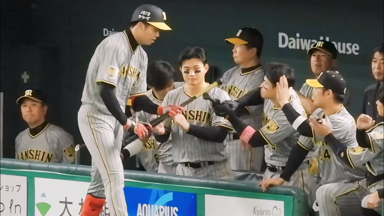 【お茶目なテルさん】バント成功の才木にバントの構えをしてベンチで出迎える佐藤輝明 2024.5.5