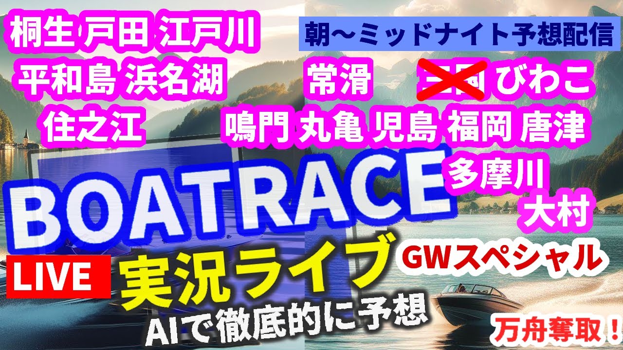 【5/6 ボートレースライブ GW桐生 戸田 江戸川 平和島 多摩川 浜名湖 常滑 びわこ 住之江 鳴門 丸亀 児島 福岡 唐津 大村】万舟 競艇AI予想 裏でネリvs井上 生放送