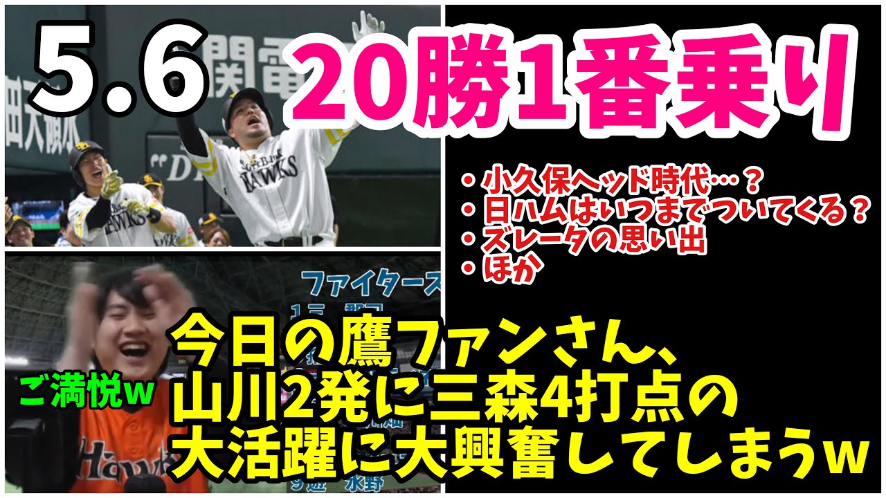 今日の鷹ファンさん、GW最終日に山川2発三森4打点の大活躍で大興奮www和田おじ勝利で20勝リーグ1番乗りw 2024年5月6日 福岡ソフトバンク対北海道日本ハム 試合ハイライト