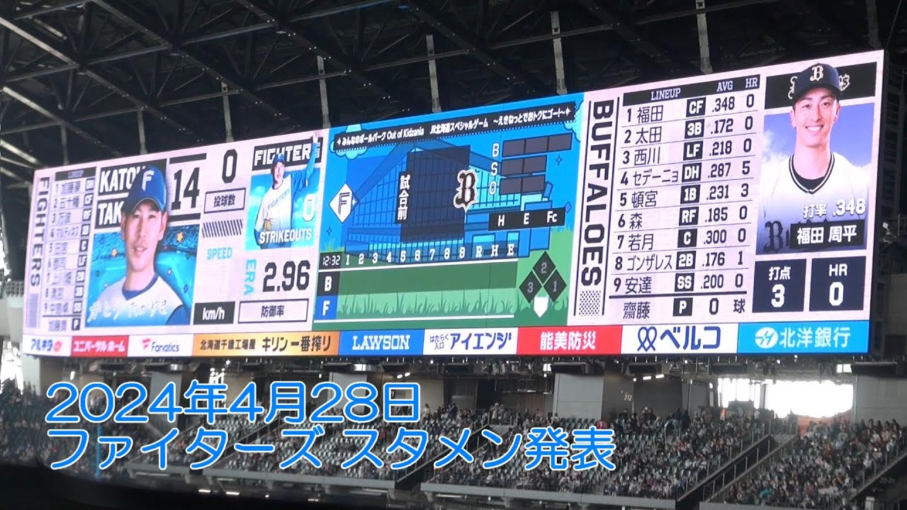 2024年4月28日、エスコンフィールド北海道での北海道日本ハムファイターズVSオリックスバファローズ 5回戦にて、ファイターズのスタメン発表シーンです