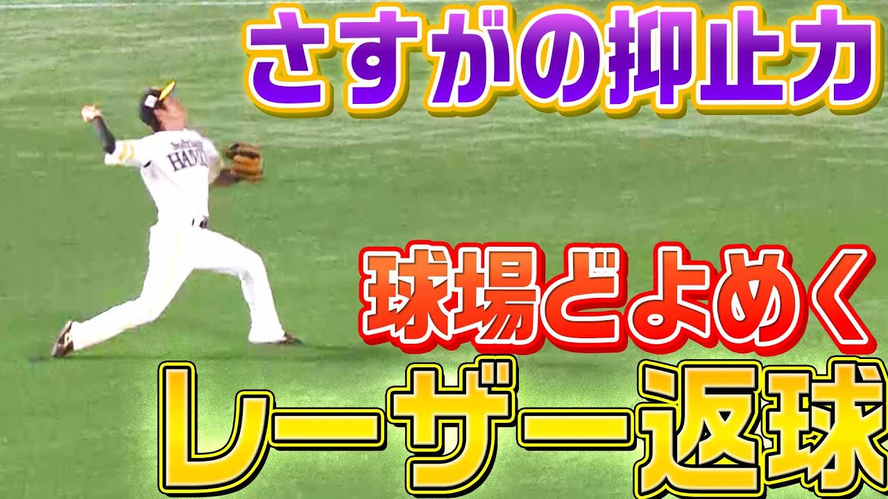 1,2塁の場面、ライト前に打球が転がり、1点が入る…と思われたが、ライト・上林誠知が目の覚めるようなレーザー返球。2塁走者は3塁ストップとなり、生還を許さなかった!!