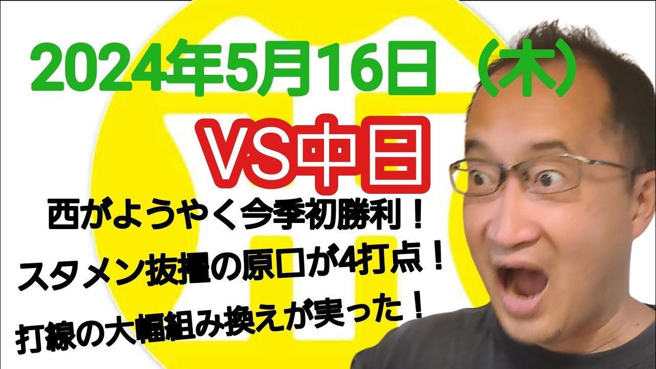 【阪神タイガースについて語る動画】2024年5月16日(木) ● 中日 4 × 9 阪神 ○ 西が6回2失点でようやく今季初勝利! 4番原口がホームランを含む4打点! 打線の大幅組み換えが成功!