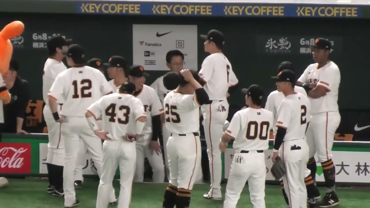 サービス精神旺盛な矢野コーチとオコエ 瑠偉 円陣前にリラックスしている巨人選手たち 現地映像