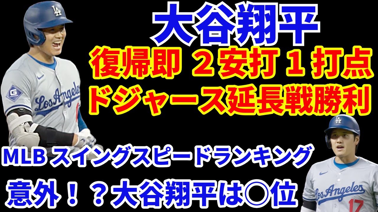 大谷翔平 復帰即2安打1打点の活躍‼️ ドジャース延長戦勝利🙌 MLBスイングスピードランキング 意外⁉️ 大谷翔平は○位‼️ 山本由伸 3ランHRと連続四球が悔やまれる💦