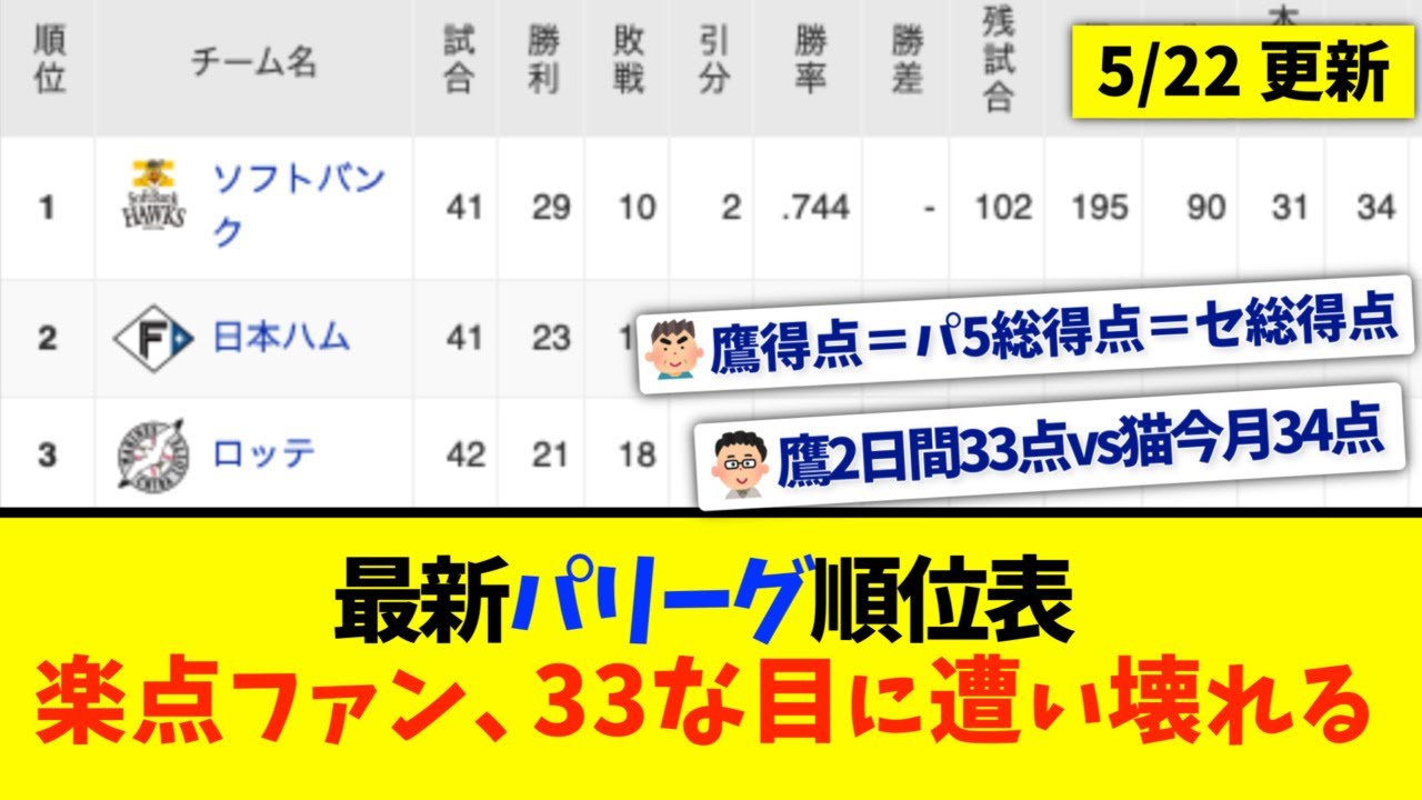 【5月22日】最新パリーグ順位表 〜楽点ファン、33な目に遭い壊れる〜