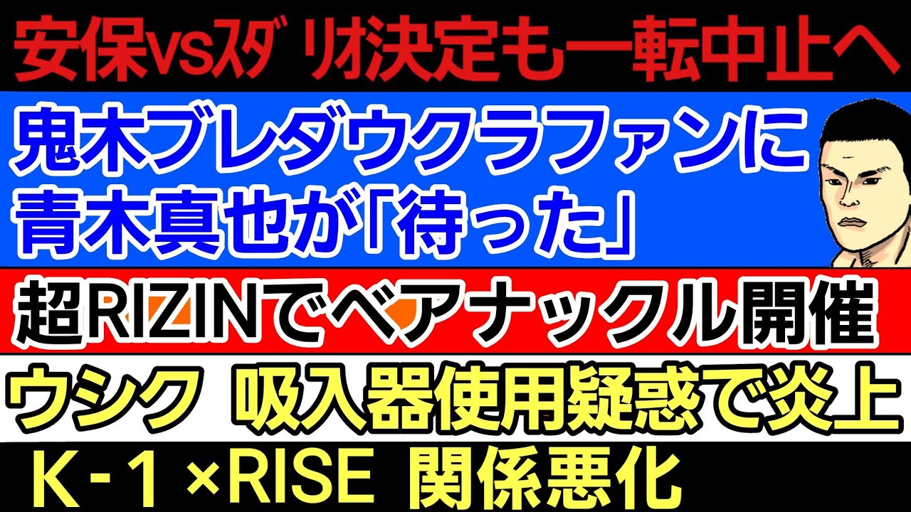 〇安保ルキヤvsスダリオ剛 決定も中止か〇『鬼木審判 ブレイキングダウンクラファン』に青木真也が「待った」〇超RIZINでベアナックル開催〇ウシク 反則疑惑で炎上も…〇K-1×RISE 関係悪化