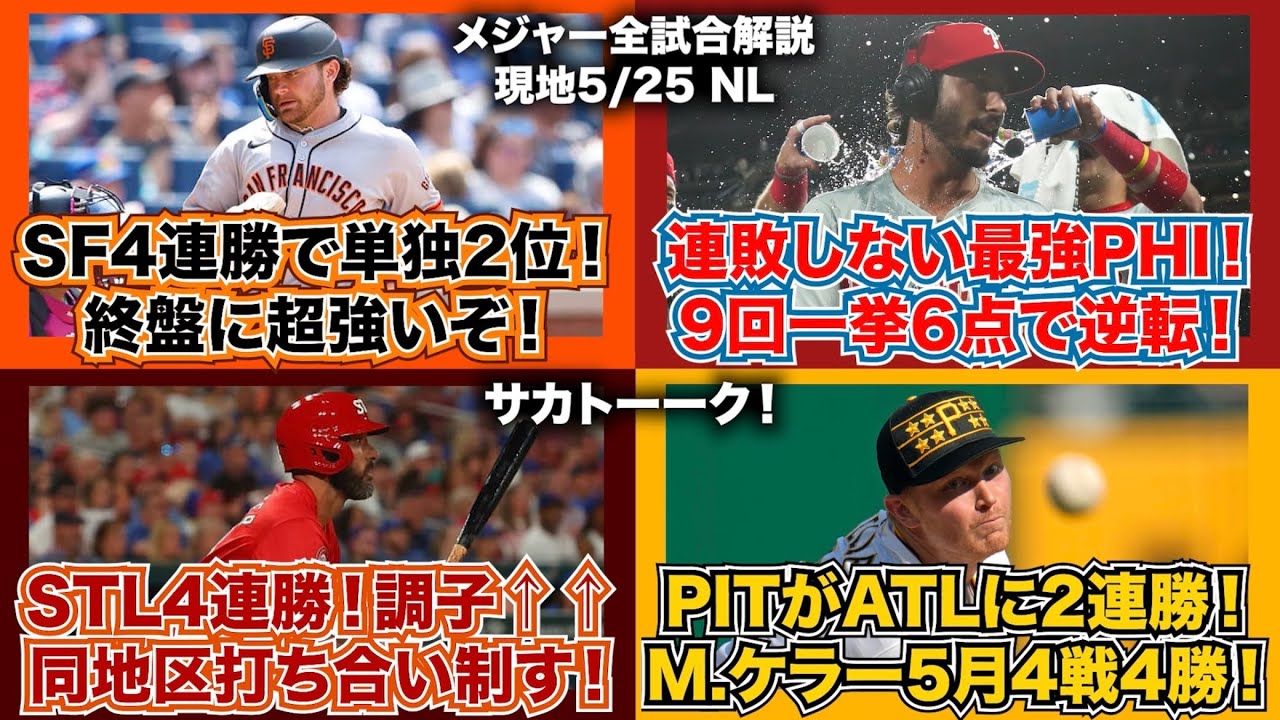 【NL59/162】ジャイアンツが4連勝で単独2位!終盤に超強い!連敗しない最強フィリーズ!9回一挙6点!カージナルス4連勝!打ち合い制す!パイレーツがブレーブスに2連勝!M.ケラーは5月4戦4勝!