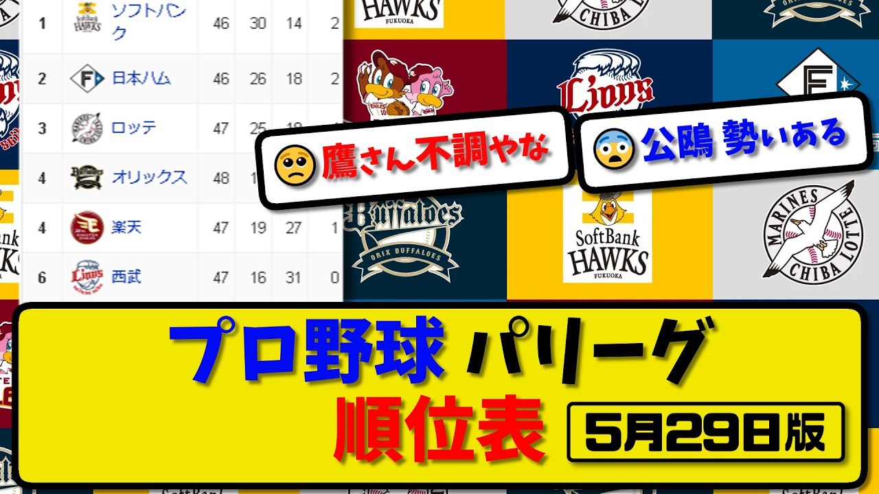 【最新】プロ野球パ・リーグ順位表 5月29日版|1位ソフ● 2位ハム○ 3位ロッテ- 4位オリ● 5位楽天○ 6位西武○|【まとめ・反応集・なんJ・2ch】 #順位表 #オリックスバファローズ #福岡ソフトバンクホークス #千葉ロッテマリーンズ #日本ハムファイターズ #東北楽天ゴールデンイーグルス #西武ライオンズ #プロ野球 #反応集 Tohoku Rakuten Golden Eagles東北楽天ゴールデンイーグルス NPBHUB.COM | The Fanbase of Nippon Baseball & Nippon Professional Baseball