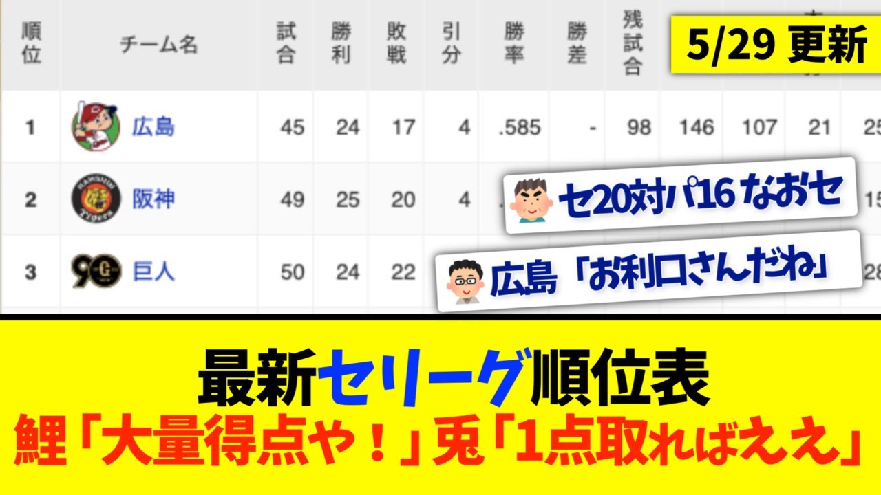 【5月29日】最新セリーグ順位表 〜鯉「大量得点や!」兎「1点取ればええ」〜