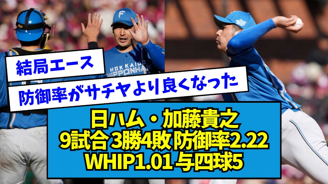 【防御率サチヤ超え】日ハム・加藤貴之 9試合 3勝4敗 防御率2.22 WHIP1.01 与四球5【なんJ反応】