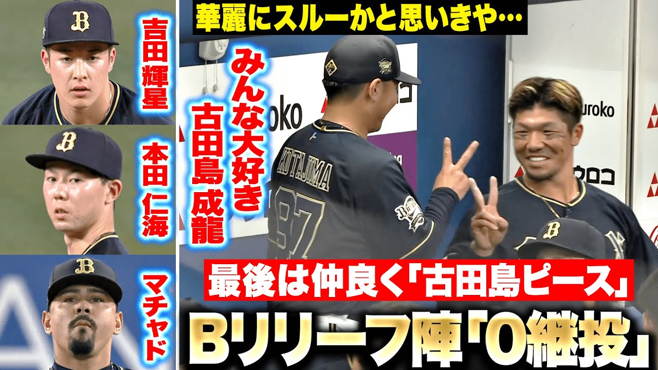 1点差での登板となったオリックス・吉田輝星は2死3塁のピンチを背負うも、代打・牧秀悟をセンターフライに打ち取り切り抜ける。続く古田島成龍は3者凡退に抑える安定のピッチングでいまだ防御率は0.00。ベンチでは頓宮裕真にハイタッチをスルーされるも…最後はピースで笑顔✌️本田仁海も3者凡退2奪三振の好リリーフ。最後はマチャドが締め、オリックスリリーフ陣が1点リードを守りきった!!!