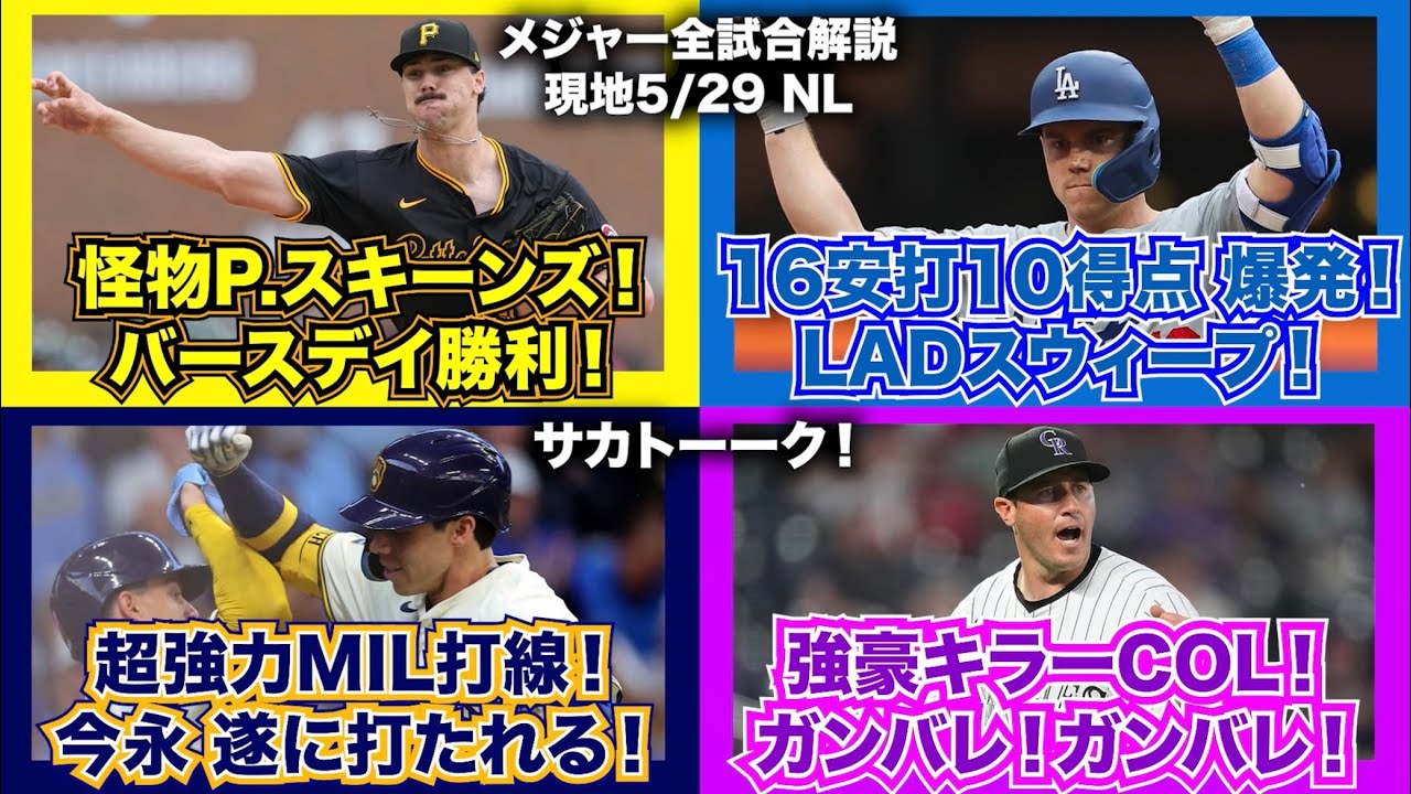 【NL5/29】怪物P.スキーンズ!バースデイ勝利!16安打10得点爆発!ドジャースがスウィープ!超強力ブルワーズ打線!今永が遂に打たれる!強豪キラーロッキーズ!ガンバレガンバレ!