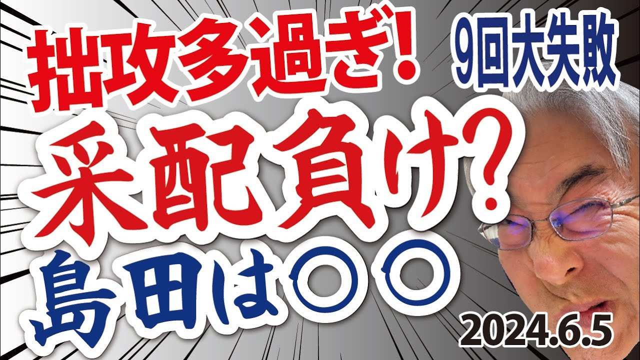 2024.6.5 神2-3楽、5度の拙攻と9回2ラン(被弾)で逆転負け、先発大竹・粘投7回途中0点も勝ち付かず