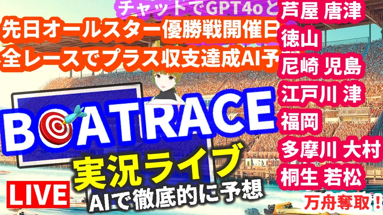 ボートレース芦屋 唐津 徳山 尼崎 児島 江戸川 津 福岡 多摩川 大村 桐生 若松 chat GPT-4o Vtuber AI