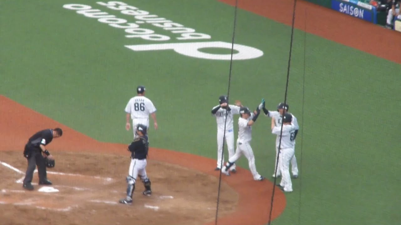 外崎修汰 レフトオーバーの同点タイムリーツーベースヒット、2アウト2塁。