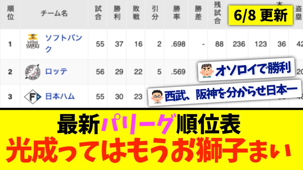 【6月8日】最新パリーグ順位表 〜光成ってはもうお獅子まい〜 ◆WBC映画『憧れを超えた侍たち 世界一への記録』 https://amzn.to/3NxMEJf #パーソルパリーグTV #パシフィックリーグ #プロ野球ニュース #なんJ #ハイライト #福岡ソフトバンクホークス #東北楽天ゴールデンイーグルス #オリックスバファローズ #埼玉西武ライオンズ #北海道日本ハムファイターズ #千葉ロッテマリーンズ #5ch #なんJ #2ch #まとめ #2ch反応 2ch2ch反応5chChiba Lotte Marinesオリックスセ・リーグソフトバンクなんGなんJなんJベースボールchなんJ野球王パ・リーグプロ野球ニュースプロ野球報道すてぇしょんまとめメジャーリーグようこそ野球さん千葉ロッテマリーンズ大谷翔平巨人日本ハムファイターズ楽天イーグルス西武ライオンズ野球阪神タイガース NPBHUB.COM | The Fanbase of Nippon Baseball & Nippon Professional Baseball