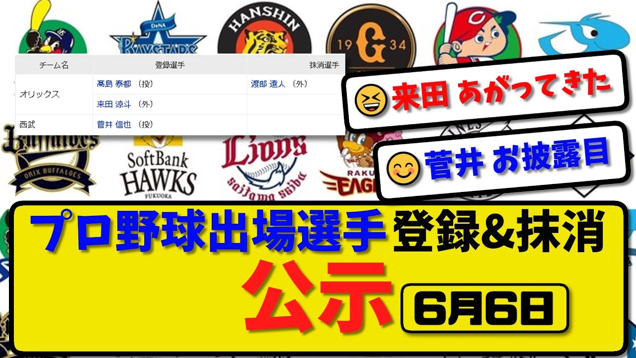 【公示】プロ野球 出場選手登録&抹消 公示6月6日発表|オリックス渡部抹消|オリックス高島&来田 西武菅井ら登録【最新・まとめ・反応集・なんJ・2ch】