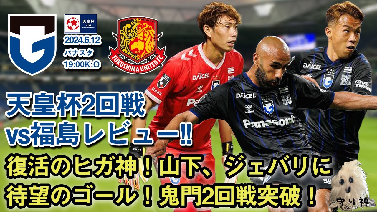 はい守り神の独り言ですではですねえ今日 のえレビュー動画の方やっていきましょう 今日のレビューがですね6月12日え 水曜日ですねミドウクの試合でベス福島 ユナイテッド戦ということで天皇杯2回戦 の試合が本日パナスでホームゲームで19 時から試合が開催されましたこちらの レビュー動画の方やっていきましょうあの 前の動画でも言ったんですけれども今です ね本月中にチャンネル登録500人って いうところ今目指してやってますので是非 ねチャンネル登録まだやってないっていう 人に関しては動画の最初にですね チャンネル登録していただければ非常に 嬉しいですあの私現地感染だったので ちょっと現地でね見てきた内容だったりと かだいぶ前の方で感染したんであの旗で 見えないところとかあんまり見えてない ところとかもあったのでゴール裏から見て たんでねゴールシーンなんかほとんど1番 反対側でま後ろから見てるような感じです よねだからもしかしたらちょっとねあの 状況とかですね性格じゃない部分も少し あるかもしれないですけどもま私のね現地 からの見たところでの試の流れだったりと かえ試合のねそれぞれの総評みたいな ところで今回のレビュー動画にさせて もらえたらなという風にはまず思いますで ま試合結果の方はね皆さんご存知だと思う んですけれどもえ30解消ということで クリーンシートねも今シーズン19試合中 8試合目のクリーンシートということで 本当に素晴らしいえ試合となりましたので まこの試合をねえ少し前半からま振り返っ ていきましょうはいまずですね スターティングメンバーの方見ていき ましょうかえゴールキーパーが東口ですね コヤト監督もね前の日の会見で言った通り 東口初スタメンということで今シーズン初 スタメンの東口を使ってきましたで右 サイドバックに松田陸そしてデンスライン が中谷福岡黒川ということでまハンダー リックがねオリンピック代表でアメリカか な行ってますので新前時代でまそれもあっ てでまハンダリックがねオリンピックで おそらくちょっと離脱するだろうなって いうところも濃厚なのでまそれを考えてね マダリックここで使えたってのは非常に 大きいところかなという風に思います ダブルバンチいつも通りですねダワと鈴木 徳馬がダブルバンチでえ右にやました左に はねウェルトンではなくて倉田を使ってき ましたでトップ下に山田太そしてワン トップにジバとなっておりますジバは えっと後戦以来のスターティングメンバー という風になりましたでサブメンバーです ねサブメンバーはゴールキーパー一守 そしてディフェンスが江川そして岸本三藤 そしてウェルトン宇坂本となっております 相手ですね福島ユナイテッドの方ですけど もゴールキーパーが山本そして ディフェンスラインが4枚で右から松長 大森道花秋山となってましたそして中盤3 人が加藤張ヶ谷宮崎フォワード3人が吉水 矢島という風になっていました433です ね試合の入りとしては結構ねその福島 ユナイテッドの方が試合の入りとしては 非常に良くてあのガバとしてはその福島が どう戦ってくるのかっていうところに対し てなかなか相手の選手を捕まえきれないっ ていう印象があったんですねで特に相手の 8番の選手ですね右サイドの選手だったと 思うんですけれども吉永選手かなが非常に ねこうウイングなんですけどもうウイング のポジション全く取ってなくてま中盤を 結構もう自由に動き回るみたいな攻撃的な ところをずっと自由に動き回るみたいな 感じでま真ん中によく入ってくることが 多かったんですけども福島ユネてもね結構 そのフロンターレっぽい戦いをするって いう監督さんが元々フロンターレの寺監督 ってところもあったりとかあの フロンターレからね選手をねその大関選手 だったりとか松長選手だったりとかま連れ てきてるっていうのもあって結構フロン ターレっぽいサッカーをするっていう印象 があってまその通りですね結構中から中 から崩したがるっていう真ん中をねかなり 使ってボールポセッションを従が るっていうチームだったので真ん中の部分 で結構人がこうね入れ替わり立ち代わり 入ってきてワンタチタチでえボールを 動かしていくっていうのがねあの得意な プレイスタイルだったのでそこにこうね 最初適用するところだったりかマークの 受け渡しみたいなところでガンバが最初ね ハではちょっと苦労したのかなという風に 思うんですけれどもまそこでもねやっぱ 最初しっかりもう相手にペース握られたと しても守り切るみたいなところは 今シーズンのガンバしっかりできるのでま そこでねしっかり最初の10分15分 ぐらいしっかり守り切ってまそこから徐々 にねガバのペースにしていったのかなって いう風には思うのでま最初なかなかボール が握れなかったりとかボールを奪えないっ てことが続いたんですけどもそんなにね見 てても最初はまじっくり相手の出方を伺う というかね相手の動き