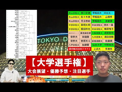 え今回ですね山県さんに来ていただいて ますがあ先日ですね早稲田大学東京6大学 もえ出場するチームが決定しましたのでえ 大学選手権についてですねま優勝予想大会 展望注目選手みたとこで山県さんに色々 聞いていきたいと思いますよろしくお願い しますはいお願いしますはいそれではです ねまずトーナメント表の方をご覧 くださいはいまずですね大会のえ展望等に えついて聞いていきたいと思いますがはま 27個全部揃いましたというところでまあ 何個か有力なチームとかをちょっと聞いて いければなと思いますし初戦のこのカード が見所とかまそんな感じのところでですね え聞ければと思いますが早速いかが でしょうかはいまずまやっぱりこの大会の 中心としてはあの東京6大学の代表とトト の代表がま過去遡って優勝回数とかまあの ダトで抜けてるのでうんま意味でやっぱり 大学とえ青山学院大の2つはま勝候補の2 大巨ま筆頭として挙げられる学校なのか なっていう風に思いますそうですよね結局 ま地方頑張ってるよね地方面白いよねって それ本当事実としてあると思うんですけど でもやっぱ近年でもやっぱ蓋を分けてみる とやっぱ6大学党とがやっぱなんだかんだ 勝つなみたいなのはありますよねそうです ね結局その去年もえ全日本がえ明治と青学 のえ決勝でうんで神宮大会も決勝は京と青 でしたしうんうんやっぱりあのなかなか 地方で決勝に上がってくる残ってく るっていうのはうんあの難易度高いしあの 今年で言うと藤代みたいにあの全国狙え るって言われてたチームも局その地方の リーグの中あの勝ち切れないっていうのも あったりするのでやぱそういった意味では その6大学等々ちいてきた学校ってのは やっぱりあのかこたる強さみたいなあるの かなっていう印象ですねそうですよねま 大学は最初連勝で始まりましたがま ちょっと最後の方にまやっぱりトトって 難しいなっていうのをありながら最後勝ち 切ったでま早稲田も最後早計戦でえま ちょっと場合によってはなんか明治と 釣れるかもみたいなところですけどもで ただ6大学で早稲田予想ってまあまあ もちろんその予想自体がそんな飛びかう 業界でもないんであれなんですけどなんか やっぱ明治とか法制とかの方がちょっと なんか有利っぽいかなみたいな話をよく見 ににしてたようなまこれは僕の主観もある んですがまその中でやっぱ久々ですよね7 ぶりだっけかな確かそうですねあの川手が いたあもうそうかそうか7きってそうすよ ねうんはい以来ですまあのはいやっぱり その戦力のま足し算と言いますかその選手 メバリューで言ったら明治な高成っていう ところがま優勝候補かなって思ってたん ですけどやっぱりその6大学のぶり見てて もそのま伊藤党がでま他にもあの宮とか あとま1年生の安田投手とかあのあたりも あのみな役割こなしてましたしこう 飛び抜けたこうすごいなって選手があの 少なかったりしてもでも吉野選手とか やっぱりあのイデ選手とかドラフト候補の 選手は あのまちゃんと最後まで結果残してきまし たしまあと個人的に大きかったなって思っ たのはあのショートの山形選手ですかね おお確かにうつほも頑張っやっ見てもはい 守備はあの頭抜けてましたしうんあの期 その宗山選手があのお休みほとんどお休み だった中で言うとやっぱりその6大学で 一番うまく見えたなっていうのあの山形 選手なの でちょっとあの大学選手権の中でもあのま 打つ方も結構成績良かったみたいなので うんその全国の部隊でどのくらい成績 残せるのかなっていうのちょっとしてます うんそうですねまあまあ打ったとはいえ やっぱ守備から評価されるタイプでは 間違いないと思うのでそうですねじゃあま 青学早稲田というところがやっぱ軸になっ てきますという中で他にちょっと追随する イメージをちょっとお話しいただきたいん ですけどいかがでしょうかやっぱりその1 週間短期間でえ試合が続くのでま投手の 枚数がいる学校はやっぱり有利になって くるのかなっていうイメージですはいと いうところでであの個人的に注目なのがえ 普の学院代とえあと提供台わあなるほど なるほど はいまあの単純に一生あの1試合少ない山 になってるっていうのとあなるほどですね の枚数的にもその揃ってるんじゃないのか なっていう風にうん思うのでうんとはその まあ1試合まあの多い山になっちゃうん ですけどま中央学院代も手揃ってますしえ あと仙台台ねうん うんあと上部台なんかもその1試合少なく てでまあの左の井投手とあと右の木口投と か ああの でまこの辺りやっぱりあの優勝争い絡んで くるかなベスト4とかに入ってくるかなっ ていう印象ですねなるほどですねそうです よねそう八の学院はそのさっき山けさん 言われていてた藤代をま藤代は倒せてない んですよねただリーグ戦としては優勝して みたいな感じですけどまあの絶対有利と 言われていたま最高戦力と言われていたフ 代がまちょっと破れて8の配には
