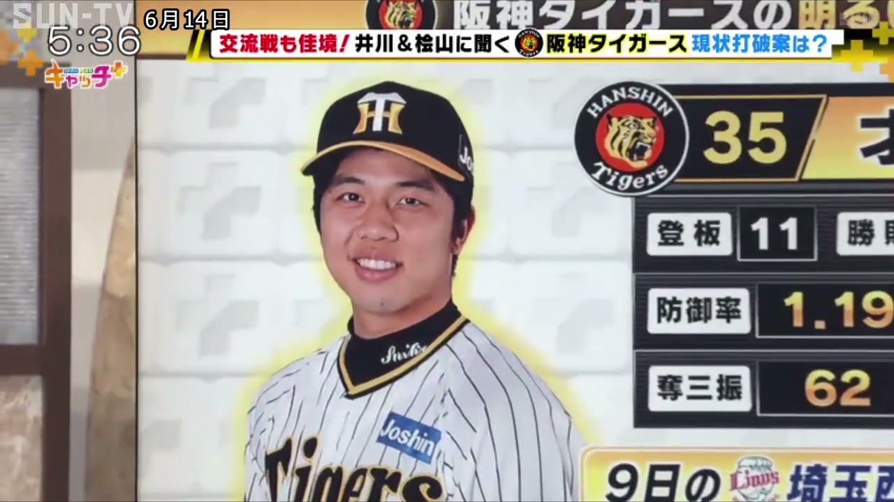 ということで今日は特別企画をお届けし ます2週間ぶりの登板です村上あお願いし ますはいよろしくお願いいたしますまさか 今日も登板があるとは思ってはいなかった んですけれどもさてま交流戦なんです けれどもプレ火を迎えておりますのでここ でですねタイガースのこれまでの戦い さらには今後について井川さんと共にお話 を伺っていこうという風に思います井川 さんよろしくお願いしますよろしくお願い しますまずはではタイガースの交流戦の 成績から見ていきたいんですが級杯交流性 の順位がなんと11位ということでもう タイガースファンにとってはあまり見たく ないということでちょっとここではいお 天気カメラ行きましょうお天気カメラお 天気カメラ行きましょうあコートタワー 映像が出てますねさんはい和みますねそう ですねいい雰囲気ですよねこれねはいはい 坂原さんも野球のコーナーをちょっと忘れ させるようなそうですね今ほっとしました はいほっとしましたねはい遊んでる方もね ちらほらとほする時間もやはりということ でまガ昨日連敗は止めたとはいえ交流線の 全体を見てみますとなかなか打線が機能し ていないということで木曜コメンテーター の日山慎次郎さんにバッター目線で ちょっとポイントを伺ってまいりましたご 紹介しましょうまず1つ目です今後 タイガースのバッター人に必要なこと1つ 目狙ったボールが来た時に100%芯で 捉える技術がまず必要だとそして2つ目な んですがカウントが浅い時にまっすぐ ストレのことですねストレート狙いの場合 そのストレートが来たらしっかり捉えて くださいとこういったポイントを上げられ ていましたさらにはバッターズが投手人に こう影響もしてくるんじゃないかという ことで今は打線が2点取るのが精一杯打っ て支えてあげないとピッチングの幅が 狭まってしまうんじゃないかという木山 さんのまお話なんですが美川さんどう感じ ますかそうですねまやっぱ点数があるとま 楽にピッチングはできますけど山さん なんかすごい難しいこと言ってますよね この100%っってまつまり1級で捉えて ほしいということですよねあかなり難しい ですけどねこれできたら最高ですよねうん うんやはりただ心理的にピッチャーにもっ ていうところあるんですかそうですね やっぱり点数がこうね取ってくくれると 相手の攻撃がタパになるんでだいぶ ピッチングが楽になりますよねはい なるほどま打線の方がやはり機能して 欲しいというところはあるんですけれども ただまタイガースの投手陣は非常に安定し ております中でもタイガースファンが今 1番信頼を置いているピッチャーはこの 投手じゃないんじゃえこの投手ではない でしょうか最ヒト投手ですねもう文句なし のここまでリーグトップ対の7勝も上げて ますし防御率も1.1にセリーグ2位の 数字ですさらにはま先日の登板なんです けれども甲子園で行われた9日の ライオンズ戦8回途中まで井川さんノー ヒットノーランはい素晴らしいアの投球 でしたねもうちょっとでしたけどねうん うんまでも本当いいピッチングで安定し てるんでねやっぱりチームの柱としてね このまま突き進んで欲しいなと思いますよ ねえもし達成していたら2004年に江川 さんが達成して以来という阪神の中では だったんですよあと少しそうでしたねはい というところだったんですけれどもま最投 本当に今シーズン安定している要因どんな ところなんですかねいやもうまっすぐの 切れもいいですしフォークがね本当いい とこから落ちるんでやっぱあのフォークは ね落差もあって打てないですよねうん なるほど日曜日のソフトバンク戦でま おそらく登板予定ということで現在3試合 連続で無失点中イニングにしますと29回 と1/3イニング連続無失点中ですから そういった記録にも注目して是非見て いただきたいなという風に思いますさらに はま再起投資なんですけれど本当にオール スターの中間発表でも現在トップ先発部門 で2位の選手に対してえ2倍近くの得票数 を得ているというもう本当にこのまま 突っ走って活躍を続けてもらいたなという 風に思いますさあそしてま交流戦が終わり ますとレギュラーシリーズに再び戻って そしてタイガースは球団市場初の連覇ア 連覇に向けてというところになってくるん ですが井川さんはい忘れてはいけない選手 の存在がいるんですねそれがこちらです はい今月の5日に残念ながらえ調整という ことでファームになりましたが大山選手 ですま3試合2軍で試合出まして8打数1 安打犠牲フライの市田県という状況なん ですが井川さんまだ少しちょっと時間 かかりますかねそうですねもきっちりとね 仕上げてねそてもうこう仕上げてから出て ほしいなと思いますよねうんまあの日山 さんにお話を伺いましてもやはり大山選手 については去年の中心バッターなのでま 去年は全試合4番を打ちましたもちろん 期待している選手与えられた時間も義に 使っていろんなことを試してほしい