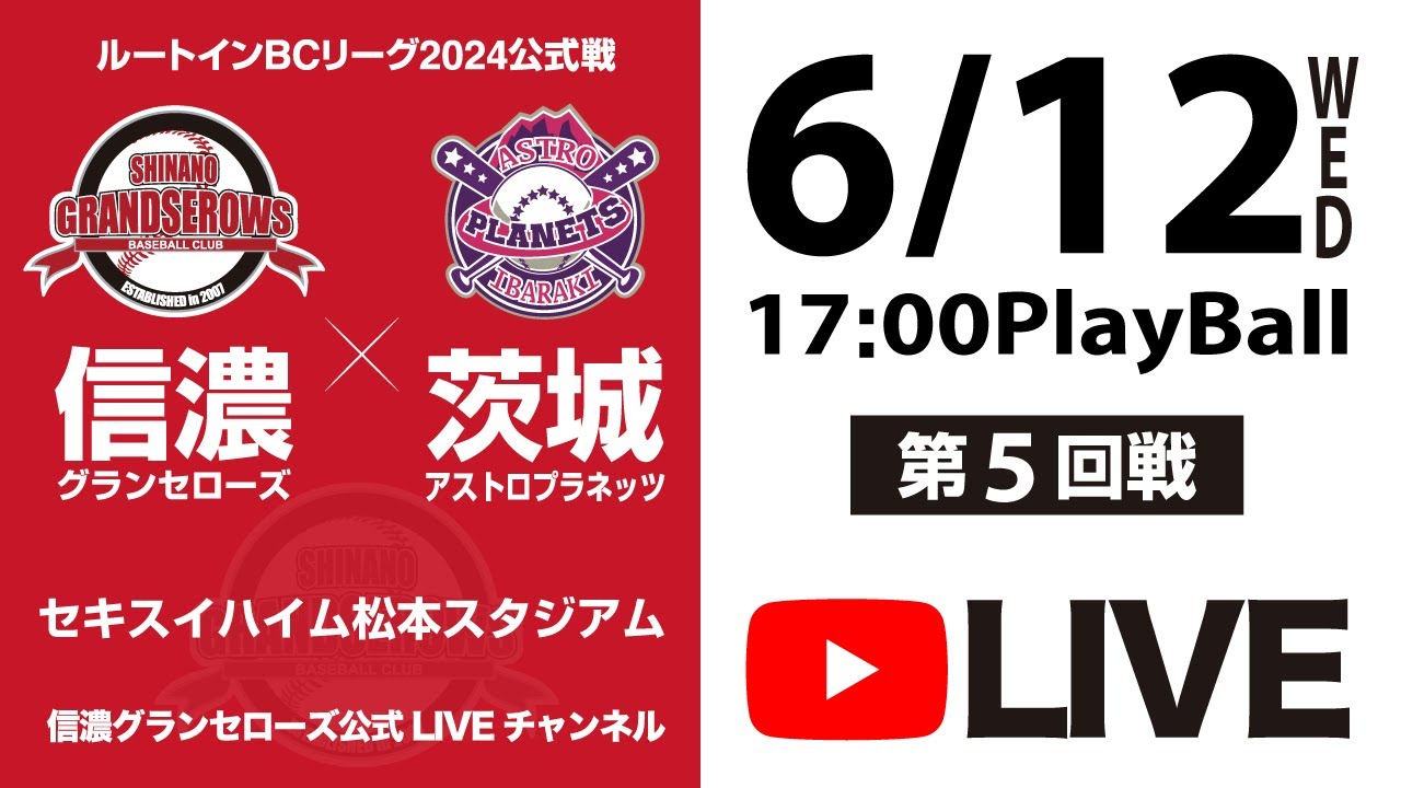 【ルートインBCL2024 信濃グランセローズ・ホーム公式戦LIVE! 】信濃グランセローズ vs 茨城アストロプラネッツ 第5回戦 @セキスイハイム松本スタジアム 2024.6.12