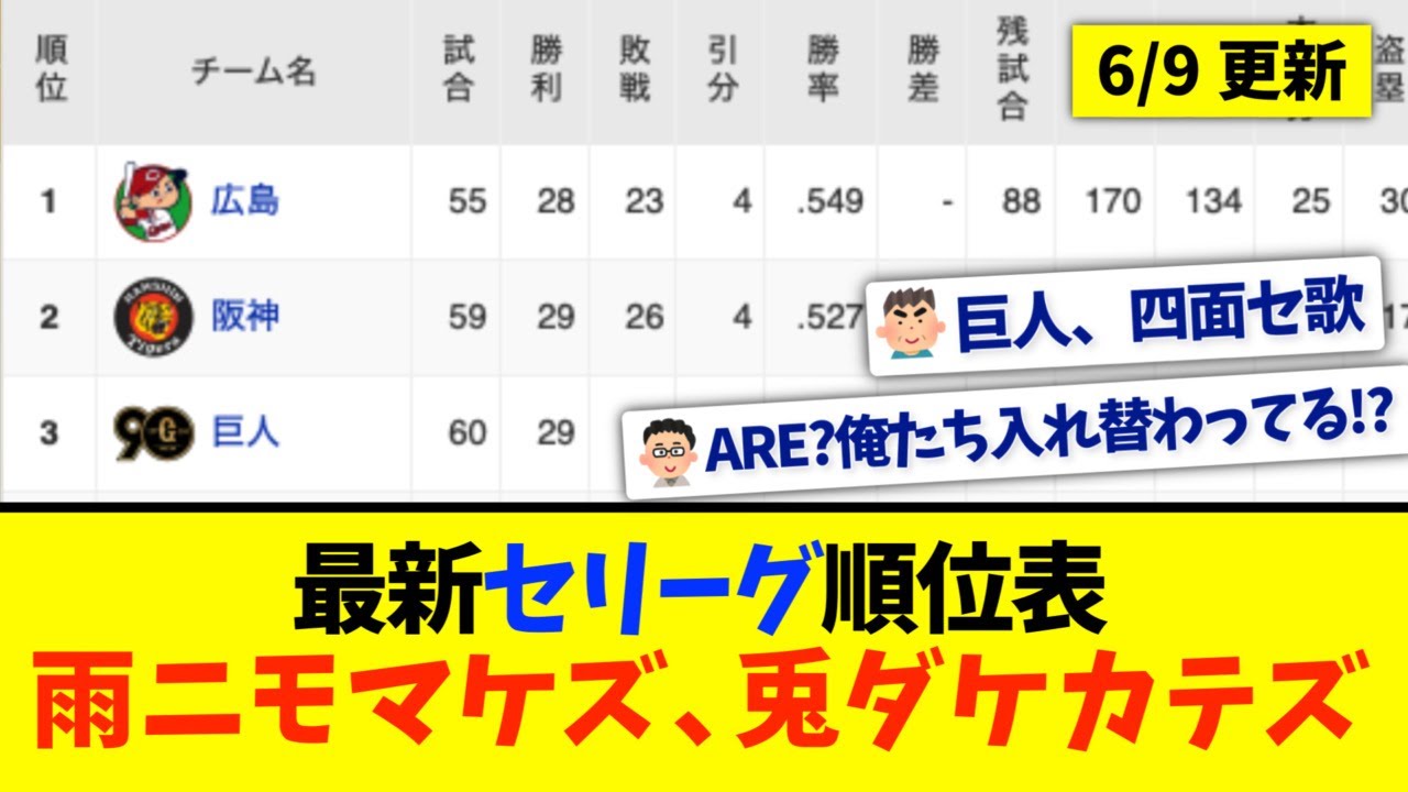 【6月9日】最新セリーグ順位表 〜雨ニモマケズ、兎ダケカテズ〜