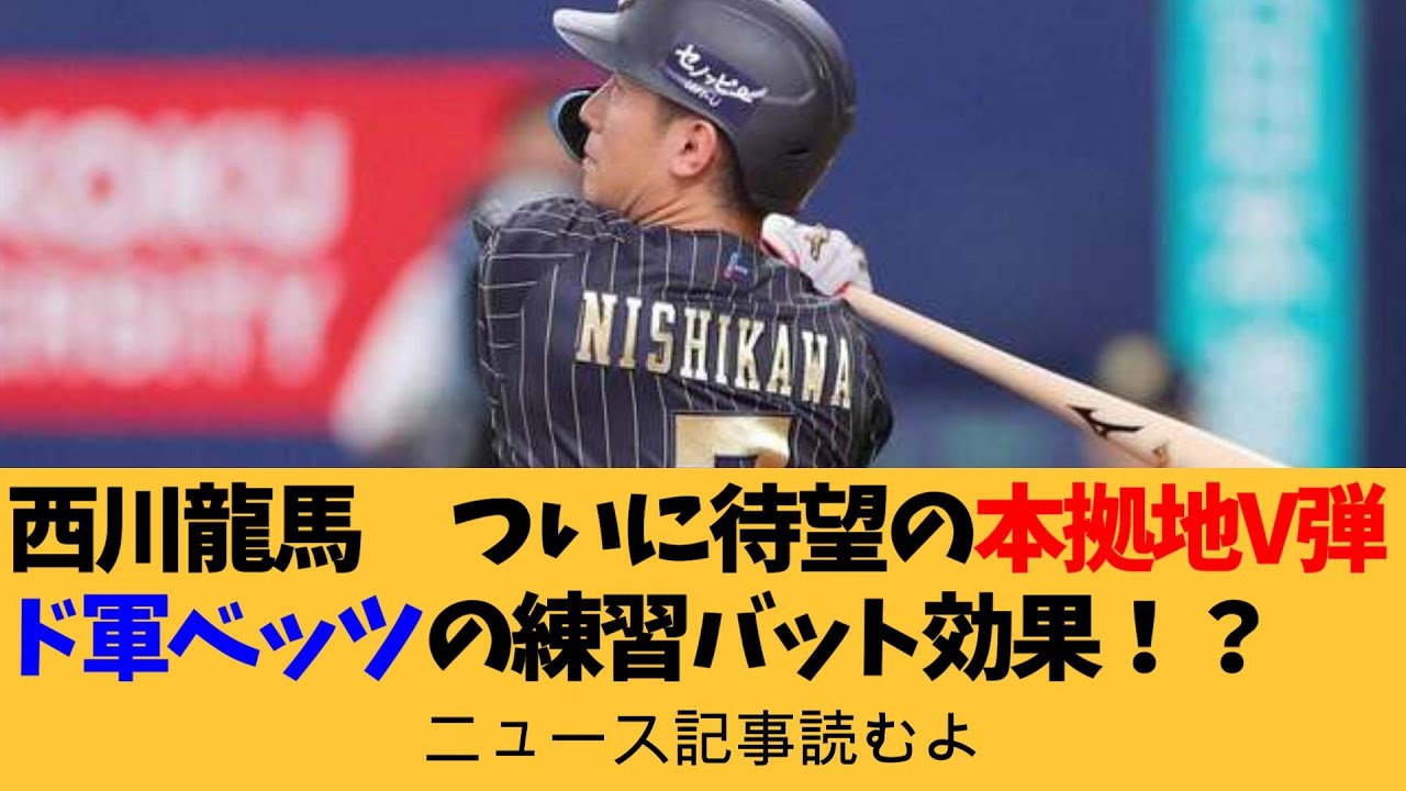 [音楽] オリックス西川両馬外野主が新本拠地のお 立ち台デビューを飾りまし た1対1の3回1アウト13塁で決勝の2 号3ラを放ちチームの連敗を2で阻止4番 の役割を果たし初めて上がった京セラ ドーム大阪のお立ち台を独特でちょっと また松田と違った雰囲気でしたと楽しみ まし た今シーズン先発2試合目の茶野織田初 先発の福永を入れた63試合で62通り目 のオーダーの軸にしっかりと西川が座って いまし たヤクルトに先制を許す重い展開を一発で 好転させまし た太田のタイムリーで追いつきなおも続い た後期で三振だけは絶対に来たくないと いう気持ちでと相手先発サイスニードの 151km速急を右翼スタンドに叩き込み まし たやっぱりホームランってすごいなと思い ますと中島監督を喜ばせた一撃でし た12日に待ちわびた相棒が手元に届き まし たドジャースの看板選手ベッラメジャー リーガーが愛用するアバットを練習で使い 始めまし たグリップ部分が斧のつなりをした新相棒 です西川にとってベッツはあれだけ コンタクトできて長打も打てる魅力的と 憧れの存在 ですそんなアイドルの相棒で試合への準備 を整え ます今シーズン3度目の先発全員アンダで 今シーズン咲た19アダを放ち得点で 圧勝西川の決勝団が流れを呼んできまし た交流線と入後は4試合連続Vだなど本来 の存在感を取り戻した打者はリーグ戦再開 後もこのまま自分のスイングができれば いいかなと思いますと頼もしかったです