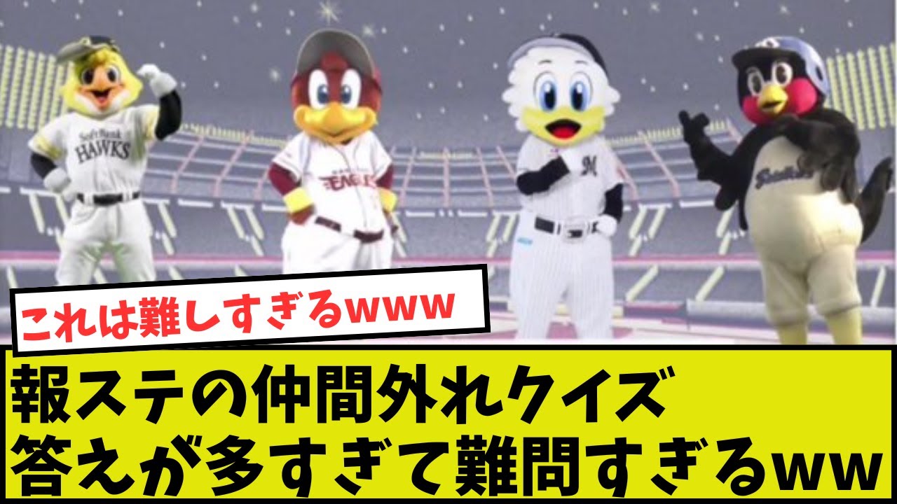 報道ステーションの仲間外れクイズ答えが 多すぎて難問すぎる問題この中で仲間はれ の球団はソフトバンク楽天ロッテヤクルト ヤクルトマスコットが全裸楽天よが在籍し てないロッテ以外はチーム名に鳥の名前 入ってるんだぞ楽天以外は片なってことや なヤクルトだけセリーグソフトバンク以外 は本拠地が本ヤクルトのマスコットだけち つろだけ飛べないつろはペギだから飛べ ないペに引っ張られるけどずはつばめなん だよな楽天だけ最初に地名がついてないん やでこれはのむさんが監督してないキルダ つまりロッテだな楽天だけチーム名変わっ てないなヤクルトだけ細川が在籍してない 本力でソフトバンクが仲間外れかなハリー だけ点できるトバンクだけウエスタン リールやぞ交流戦優勝で楽天かと思った けど自信なくなってきたソフトバンクだけ 普通に仲間外れつだけ個人事業主かな脳を したことない楽天楽天だけ21世紀にでき てる千新幹線通ってないから手だなすぐ 分かったわヤクルトだけ外国人の監督がい ないです