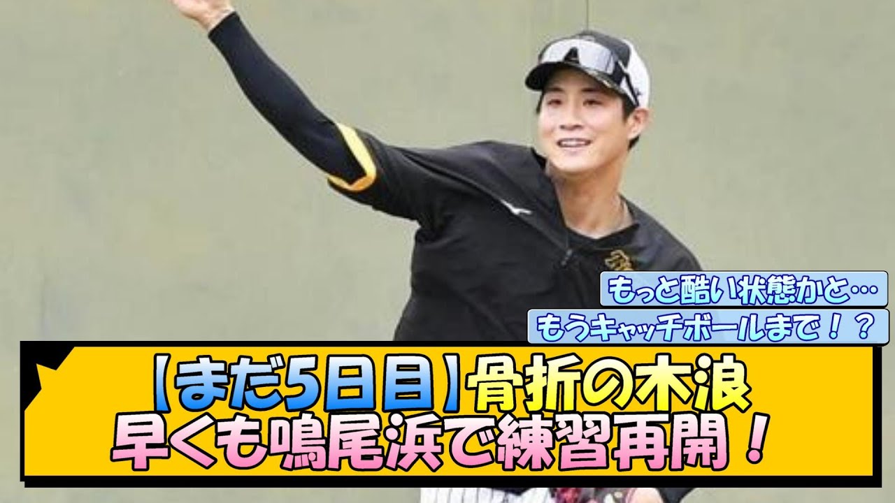まだ5日目骨折の並早くもなおはで練習 再開和谷軍監督はまずは痛みを取 るっていうのが先決なんでと話した上で ただ並行してトレーニングは続ける足は 大丈夫だ し今日はなおはでねバイク自転車をこりし てるけど体力的なところは絶対落とさない でねと明かし た肩甲骨というからもっとひどい状態を 想像してた リハビリで動けるならまだ良かった わ左肩とはいえもうキャッチボールまで やってん のプロスポーツ選手はすごいな一般神社 考えられ んまだ5日目やけどギブスもはめていない し笑って練習し てる何気ないキャッチボールでもフォーム が綺麗や な治療自体はどうなんだろう自然を待つ しかないのか な多分トレーニングの時以外セットのよう なもので固定してるんちゃうか な焦らず確実に直して元気に帰ってきて くれ よ無理せでええから8月ぐらいに帰ってき たらええん ちゃう近本の骨で打つ打法の習得チャンス や [音楽] でこれからもなJの面白いスレを取り上げ ていくのでコメントチャンネル登録高評価 よろしくお願いし ますne [音楽]