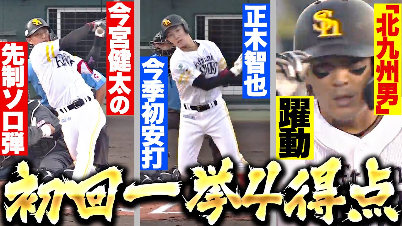 福岡ソフトバンクは初回、今宮健太のソロホームランで先制に成功!! さらに1,3塁のチャンスを作ると本日昇格即スタメンの正木智也がタイムリーヒットで起用に応える!! さらにさらに甲斐拓也がフェンス直撃の2点タイムリー2ベースヒットで北九州男っぷりを存分に発揮!! 初回から一挙4得点で主導権を握りました!!