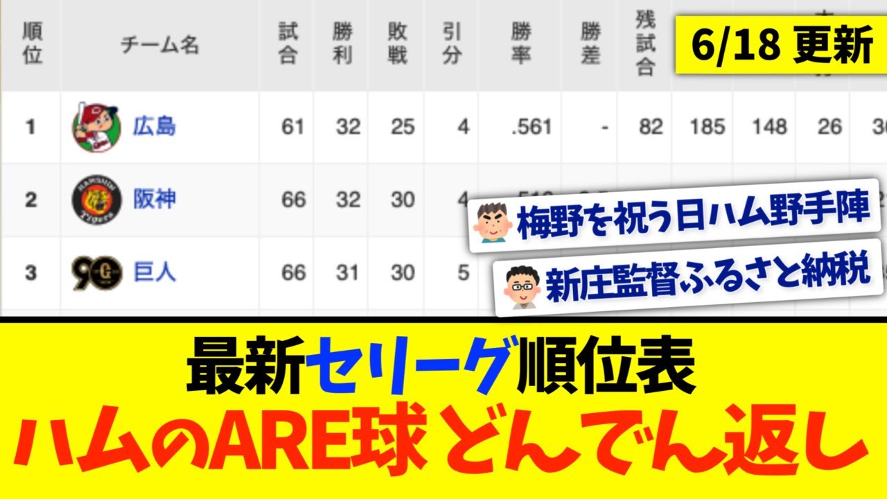 【6月18日】最新セリーグ順位表 〜ハムのARE球どんでん返し〜
