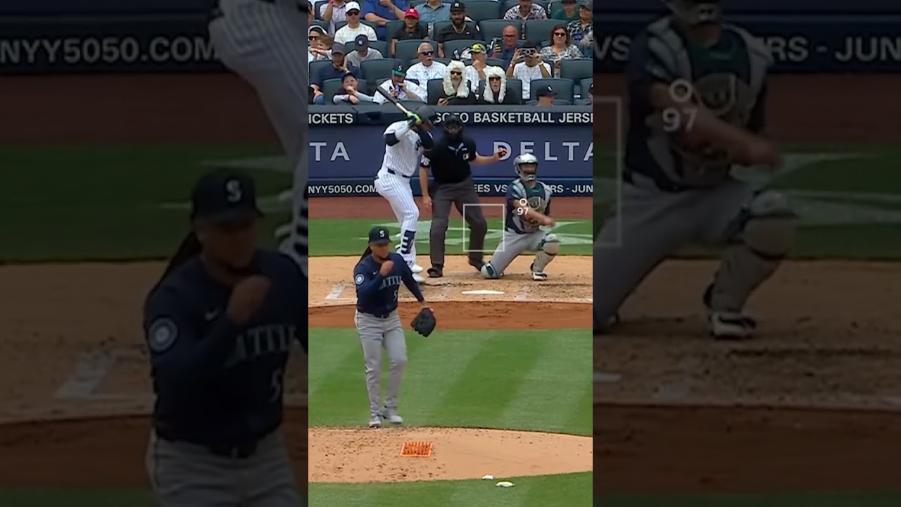 el lanzador Luis Castillo le lanzó una recta 97 millas por h con un gran desplazamiento lo cual Juan Soto no pudo conectarla y se enfadó en el momento increíble este movimiento de esta recta