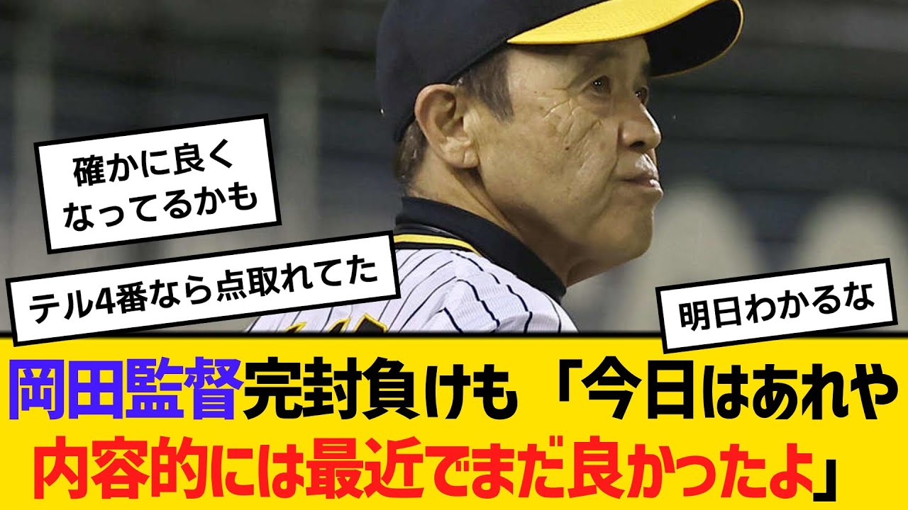 阪神・岡田監督、完封負けも「今日はあれや、内容的には最近でまだ良かったよ」 【ネットの反応】【反応集】