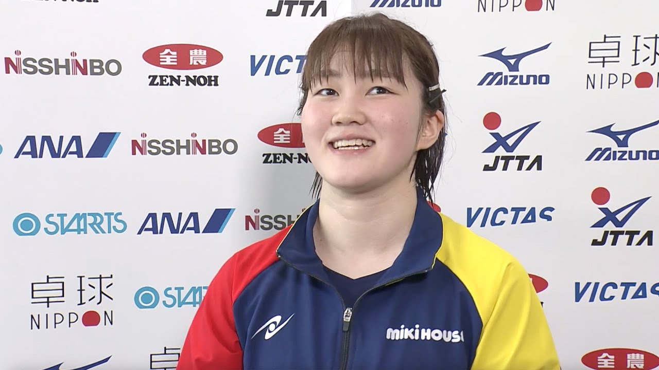 優勝おめでとうございますありがとう ございますびの声から聞かせてください はい えっとこの先行会で絶対優勝するという 気持ちでずっとやってきたのでえと決勝戦 では0対2と負けていたんですけど絶対 勝つという気持ち で頑張れて最後勝っててよかったです絶対 に優勝するということありましたけども この大会にはどういう心境で揉んでいたん ですかはいえっと同世代の原選手や崎選手 が世界選手権に行ってるのを見て自分も 絶対に行きたいていう気持ちがずっとあっ て今回が1番チャンスああると自分で思っ ていたので とはい勝ててよかったです準決勝決勝の 試合内容振り替えていただきますかはい えとどちらもカットマンだったんですけど といつも練習はしているんですけど練習 より すごく強いなと感じてそこでもくじけず 頑張れたのが良かったと思い ます特に決勝は2ゲーム最初に取られて さらに第5ゲームからにこう追い込まれた 状況からひっくり返しましたけどもどんな こと考えながらプレイしていましたはい えっとこの2ヶ月ぐらいで自分のと気持ち がすごくポジティブになってそういう 追い込まれた状況でも相手より余裕がある と思ってプレイできたのが勝てた要因だと 思いますそのポジティブになれた要因って のはどにあったですはいやっぱりその コーチが変わって坂本 コーチになってそこの気持ちの部分が すごく変わって結果その試合でも気持ちの 部分で相手に勝てていたと思うのでそこが すごく変わったところだなと思い ますこの優勝で田選手権が出場そしてこの 先の世界選手繋がっていきますけれどこの 先どうやって戦っていきたいですかはい はいと今の日本の女子はすごく強い選手 ばかりなので自分も負けずに強くなってと 世界選手権オリンピックといい成績がえ オリンピックは出てないかすいません世界 選手権でいい結果を残して次の オリンピック目指していきたいと思います やはりかなり同世代強選手が多い刺激に なるんですかはいそうですねはいいつも 試合を見 て近くにもよい選手いるのですごく2人で 切磋たくまして頑張ってますありがとう ございます
