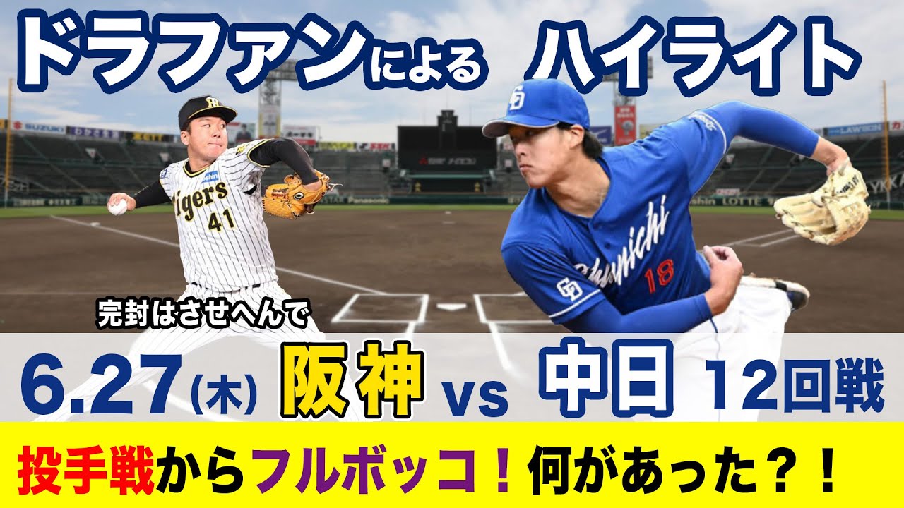 [音楽] 阪神タイガーズ 村中日ドラゴン 梅代直近10試合の得点はご覧の通り1 試合平均1.9と 1.62点取った方の勝スターティング メンバーはこちら山本に変えて8番以外は 昨日と同じです一方阪神は近本を外しまし た1番センター島田が起用されております それでは行ってみ ましょう1回表先頭仮ライトマイヒット 田中ライトマイヒットノーアウト2塁1塁 今日もいきなり チャンス今日こそチャンスを物にしろ板山 レフトフライ細川空振り三振石川サー ドゴどもか1回裏先頭島田フアボール中野 センターマヒとノーアウト3塁1塁森下 空振り三振の後大山シゴ643ダブル プレイ両チームチャンスを活かせませ ん7回裏ここまで投手戦となり0対0で 迎えた7回裏先頭中野ツベス1森下 ピッチャーゴロででしたがちょっと もたついた滅サードへ送球セーフ フィルダーズチョイスでノーアウト3塁1 塁続く大山 タリ1対0先制されたここでピッチャー 交代斎藤バッターは前側 タイムリーさてる タイムリ3者連続タイムリー4対0 はいそして8回にも4点を加えられま9回 に1点返しますけれども8対1で負けまし たボッコボコもう2点どころか8点取られ ボコボコちょっと自慢の中継陣が踏ん張り きれなかったですねうんまでも一生1ぱ 一分で負け越してはいないのでまあまあ まあよしとまし明日からはバテに帰って DNAとの3連戦初戦の先発は 高橋あこれは勝ちですね