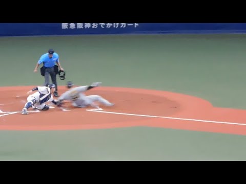 【23イニングぶりの得点は原口の神の手】 原口文仁 梅野のショートゴロで本塁突入神スライディング!! オリックスリクエスト失敗で阪神先制