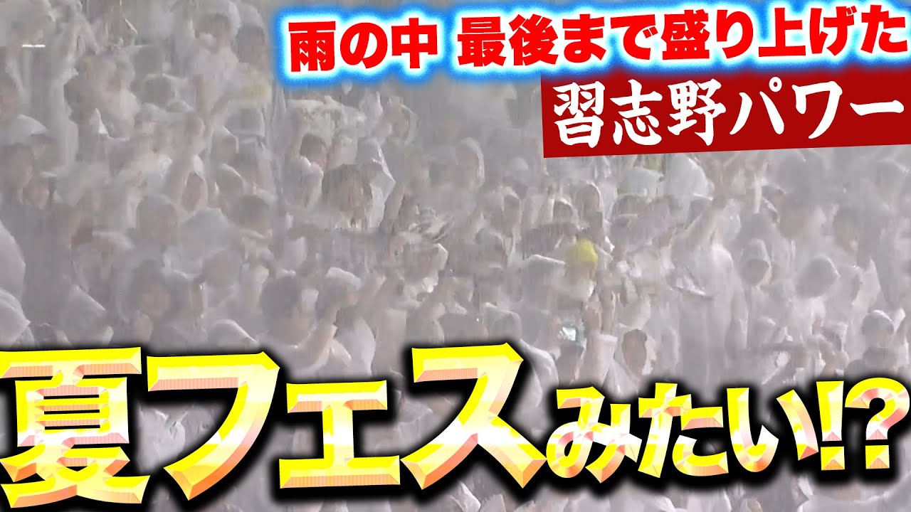激しい雨が降り注ぎ、試合は一時中断も…場内はまるで夏フェス!? 曲に合わせ大盛り上がりのスタンド!! 雨のなか試合前から盛り上げてくれた習高生に惜しみない拍手を送りたい。あたたかいお風呂につかってゆっくりと休んでくださいね。どうか風邪ひきませんように。