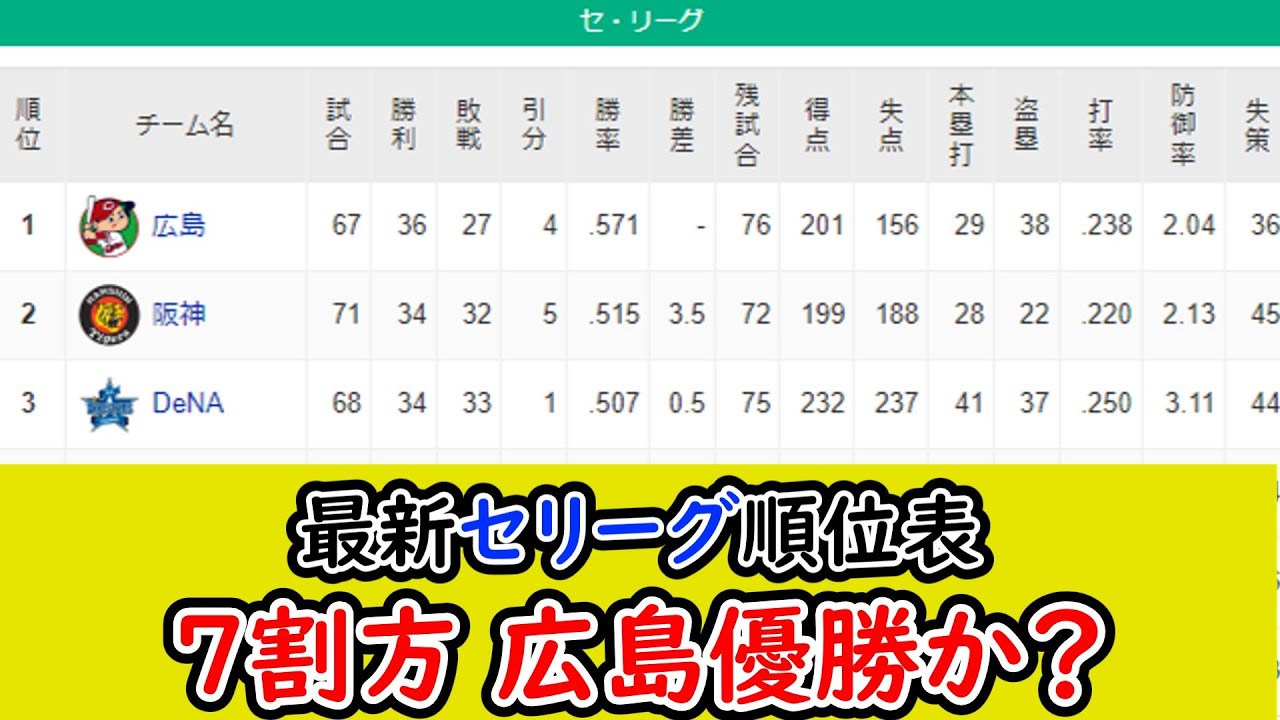 【6月27日】最新セリーグ順位表、結局広島カープ独走かなこれは