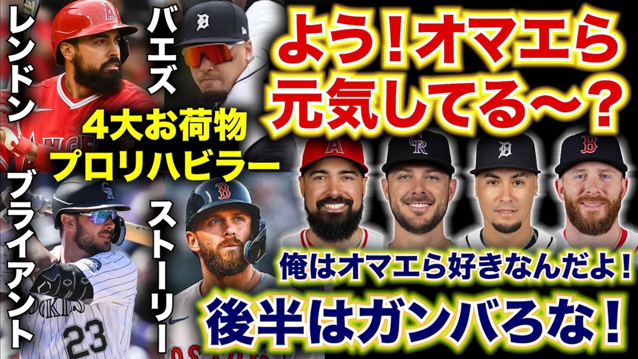 さあ始まりましたMLBパークジャパン司 の酒ですどうぞよろしく本日のテーマは ですねレドクブラストーリーバイズ前半も 終わるし後半に向けて面談する ぞようお前ら元気してるありがとうござい ますこの男たちをお忘れではないですか私 は忘れておりませんエンゼルスアンソニー レンドンロッキーズクリスブライアント レッドソックストレバーストーリー タイガースハビアバイズ現役メジャー4台 お荷物ごめんなさいいやディスりたくない 私この4人好きだからまあでも真面目に 考えればお荷物ですよねこのままお荷物で いいわけがないかつての姿を知っている ファンは悔しいですよお荷物とか言われて ということなんで今回は後半戦はなんとか 彼らに頑張ってもらおうとレドクブラ ストーリー映えず彼らとしっかり面談し まして戦に向け作戦を練っていこうという 非常に前向きな企画となっております 頑張ろうよレドクブラストーリーバイズ ごめんなさいティムアンダーソンも入れて いいですか以上5人まとめて先生がなんと かしてあげるから一緒に頑張ろうぜ怪我人 と大型契約者こそポストシーズンへ行け 頑張ろうでは早速見ていき ましょうさあということでまずは1人目 レドさんですねアンソニーレンドン34歳 とはい連おじですこんにちはこんにちはお 久しぶりですねエンゼルス所属メジャー リーグでは12年目になるサードの選手が アンソニーレンドン34歳ですよ2011 年にドラフト全体6位指名を受けて ワシントンナショナルズに入団で2014 年にレギュラーに定着してこの年は シルバースラッカー賞も取りました 2017年18年19年とこの3年間が 特にこのアンソニーレンドン最強産塁種の 1人だったんですよねこの3年間の平均の 成績が143試合に出場して打率が3割 一部の432塁打で28ホームラン166 打点OPSが953とめちゃくちゃいい 選手だわこれ3年間続けたっていう計算 ですからねこの時はアメリカンリーグの ホセラミレスナショナルリーグの アンソニーレンドンみたいなね過小評価さ れてる選手の代表として名前がよく上がっ ていたのがアンソニーレンドンのかつての 姿でしたで2020年から7年2億4 500万ドルの契約でエンゼルスに移籍し まして2021年から2023年の3年間 ね頑張ったんですけど現役最強の不良再建 となってしまいましたこの3年間の平均 成績が42試合に出場して打率が2折り3 部キリの82塁打で3ホームラン21打点 OPSが693とひえレド帰ってこいどう したんだよ本当にマジで人が変わっちゃっ たよねデスパイネの代わりにアントニーが 入るみたいなそのレベルで変わったんです よアントニーレンドン違うアンソニー レンドンですねで今シーズンですよレド 2024年19シアに出場してダリスが2 66厘のゼロホームラン3打点OPSが 632とひえまただよひえどうしようレド 開幕戦こそ1番サードで先発出場してい ましたちなみに今シーズンのメジャー リーグの1番最初の試合がこのエンゼルス とオリオールズの試合だったんでじゃ最初 のバッターだったんだよね結果は三振でし た5試合連続無アダの後は4試合連続 アンダなどなので4試合連続マルチなんか もあったんで今年は連動違うぜってところ を見せていました4月19日まで打率3割 一部三輪でOPS734とギリギリ 乗り切っていたんですよねしかし4月の 20日に走塁した際に足を痛めまして交代 とそこからここまで2ヶ月以上の離脱と なっておりますいやもう連動なんか怪我す んですか本当にま怪我をしてるのが デフォルトだから怪我してない方が逆に もうレアなんですよねヘンゼルの連動ね 復帰までもう少しの見込みらしいです野球 の練習自体は再開してるみたいなんですよ ね先日に関しては守備練習に参加した なんて報道もありましたここからはより 打撃練習を増やして調整していくみたい ですねだからまギリギリオールスター ぐらいまでは帰って来れるのかなっていう そんなところでしょうかまハム ストリングスの部分断裂なんで割と重症な んですよねねま戻ってきたとしても ちょっと守備怖いからDHあとは ファーストできたりしないんでしょうか今 ミゲルサノだったりでエンゼルスは何とか 頑張ってるんですけどこの連動がね帰って くること私は望んでおりますさあ続いて 2人目行きましょうブライアントさんです はいクリスブライアント32歳とねクブラ さんだよねロッキーズ所属メジャーリーグ では10年目になるファーストの選手が クリスブライアントです2013年の ドラフトで全体2名をかすから受けて入団 とで2015年にはオールスターに選ばれ て新人王2016年にはやはりオール スターに選ばれてこの年はMVPになった んでしたよね2017年から2020年 までのま計4年間は大体25ホームラン からOPS880ぐらいを継続してでき るっていうそんな選手でした2021年の 夏にトレードでジャイアンツの方に移籍し ていきまして2022年から7年1億 8200ドルの契約でコロラドロッキーズ の方に移籍していきましたで2022年 からは7年1億8200ドルの契約で ロッキーズの方に移籍したとただ2023 年80試