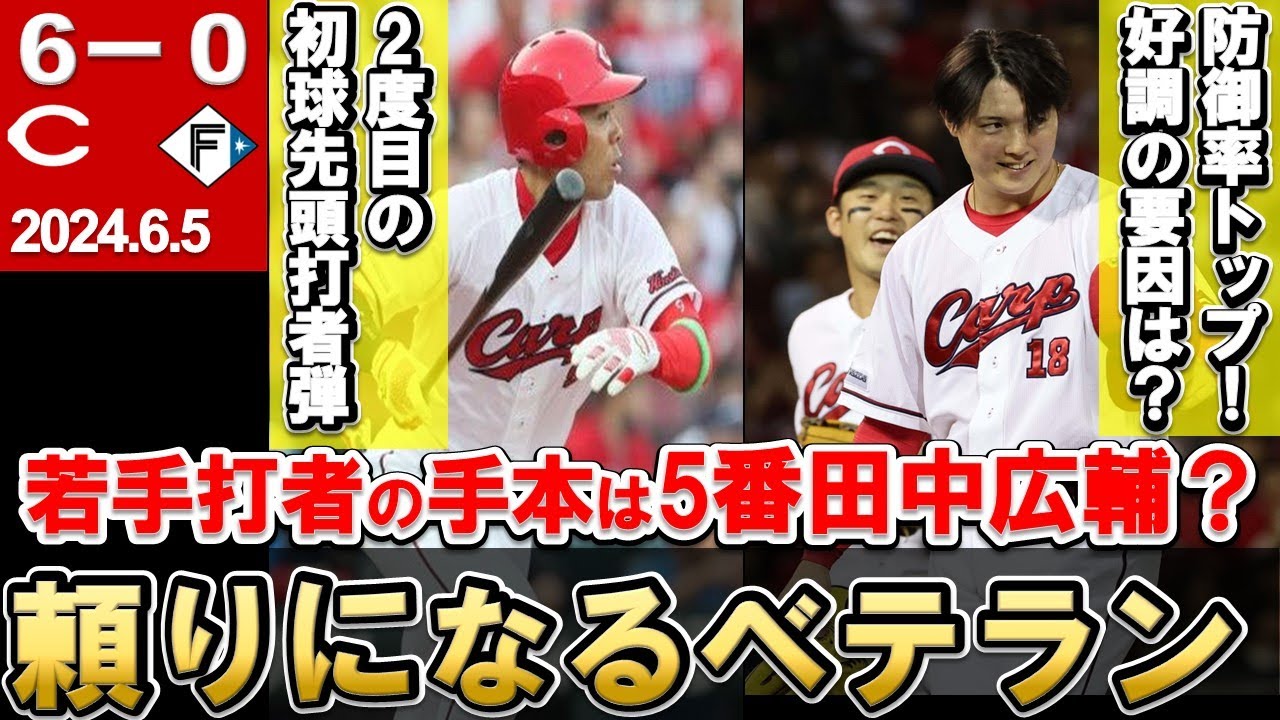 カブ好きじゃけ チャンネルはいどうもカブ好きじゃけ チャンネルです今回は5日の日販戦 振り返りますので是非最後までご覧 くださいまたこのチャンネルの登録まだの 方はチャンネル登録の方もよろしくお願い いたしますそれでは内容に参り ましょうはいということで5日の日ハム戦 ですが6対0でカープ勝利したということ で連敗を5で止めたというゲームになり ましたえ久しぶりにね嬉しい嬉しい動画 制作ができるということでですねま本当に よくね森下投手粘って投げてくれたなと いうところとまいいところでえベテランの ね田中選手からね犠牲フライだったりね出 たということでま相手のねミスに助けられ た面もねあるんですけどま勝てたという ことがね非常に大きいのかなと思いますの でまたこれの勝利をねきっかけにいい方向 に転じていくということをね期待しており ますはいでこの試合のねスタメンなんです けどえその田中選手がですねま5番 ファーストで出場したということでねま 比較的今チームの中で当たっていますので ねまこれはま1つ納得かなという風なえ スタメン器用ですで6番は菊選手7番矢野 選手で8番はね森下投手なのでえ キャッチャー務めるのは相澤選手になり ましたで得点なんですけどまずね初回です ねいきなりなんですけどえ秋山選手が初球 をねセンターへ第2号ホームランでえ先頭 出しホームランで先制しますで6回には 小野選手のバントがねまこれがないアンダ プラス相手のエラーがありまして得点し ましたでさらに田中選手のレフトへの犠牲 フライで追加点を上げますで8回にも田中 選手の犠牲フライ相澤選手の押し出し ファーボールえさらにはワイルドピッチの 間に得点ということでえ6点を上げた ゲームでし たさあで野人の注目ポイントですがこの 試合はね秋山選手ですね4ダス2安打1 打点ということでまやはりね1打ス目の ホームランですよね今シーズン2本目のね ま初球戦闘打者ホームランということでね え初球をいきなり打って戦闘打者ホーム ランにしているのがもう早くも2本目と いうのでねすごくねえ頼れるバッターに なってますねま初球からね戦闘バッターで 振りに行くってのはただでさ勇気いるん ですけどま振りに行ってでしかもそれをね ホームランにしていますのでえまさすが 秋山選手ねえこれが歴代9位になるね戦闘 たちホームラン本数だったということでま 実績も十分のね戦闘バッターになってます でセンターのところに運んだ一発という ことでまヒールインタビューでも初めて みたいな風なね語ってたんですけどま バックスクリーンのね横のねえまレフト方 よりのね横だったのでま左バッターから すると逆方向よりのね深いところに運んだ というとこでまそういうまだね力もある パワーもあるよというのが分かる一発に なりましたしやっぱりこの一発でねチーム として嫌なね雰囲気ムードがあったんです けどまそれをねえ振り切るような一発に なってえ勇気を与えてくれたんじゃないか なという風に感じましたで2本目のヒット もですね6回ね飛び出したんですけども これも先頭バッターということでま 追い込まれていたんですけどえ最後ねイン コースのまっすぐねセンター前にえ打って いったということでまこれもね伊藤投手が クイック東方なんかもねえ混ぜてきたん ですけどまそこにもまわせらずねしっかり とインコースをセンター前に打つというね 秋山選手らしいバッティングでしたでこれ でこの試マルチアンダということでですね え調べてみますとこれが今シーズン17度 目の複数アだということでですねま 今シーズン非常にえ固め打ちま複数安打2 本以上のヒットが多くなっておりますま 出場試合数がねま49試合でまこのうち数 試合はスタメンじゃなかったということを ねま考えますとま3試合に1試合以上の ペースで複数安打を打っているということ なのでねえ秋山選手がま初回ねヒット1本 出ればままた期待できるぞという状態続い ていますのでま引き続きねこういう試合の ようなね戦闘バッタホームランもねえま 打つタイプではないとは思うんですけどま こういう初初回からねいいバッティングを してチームに勢をづけてくれるというのを ね期待してますで続いてが田中選手ですね まこちら1打数ムタ2打点で1つのファー ボールということでま5番器用という中で 2打点というねえ5番打者の役割を果たし てくれました1本目のね犠牲フライから 振り返るんですけどえこのシーンはですね ワナ13塁という場面でカウントね3ボル 1ストライクだったんですけどま最後外の ね真ん中付近の真っすぐをですねえレフト に打って犠牲フライということでま本当に 本当に軽くね打ったような感じでねえ レフト方向にねもう十分飛んでいましたし まやっぱりあそこでねポーンと犠牲フライ を打てるっていうのがえ田中選手のま 持ち味だったりね今の状態の良さも表して いますでもう1本の犠牲フライがねこちら はライトに打ったというこ