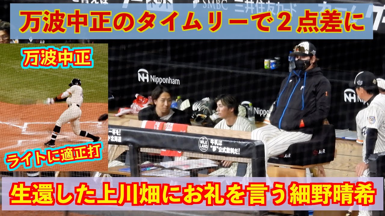 【20240703】上川畑大悟(単打)→バッテリーエラーの間に3塁へ→万波中正(ライトに適正打)→生還した上川畑大悟に細野晴希がお礼