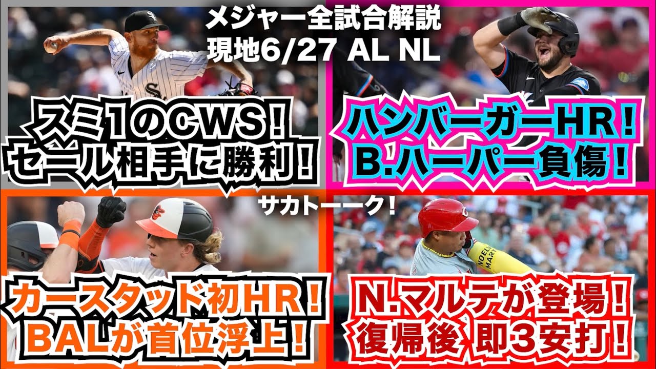 【6/27】スミ1のホワイトソックス!C.セールに勝利!ハンバーガーHRでマーリンズ勝利!B.ハーパー負傷!H.カースタッド初HR!オリオールズ首位浮上!N.マルテが出場停止から復帰後即3安打!