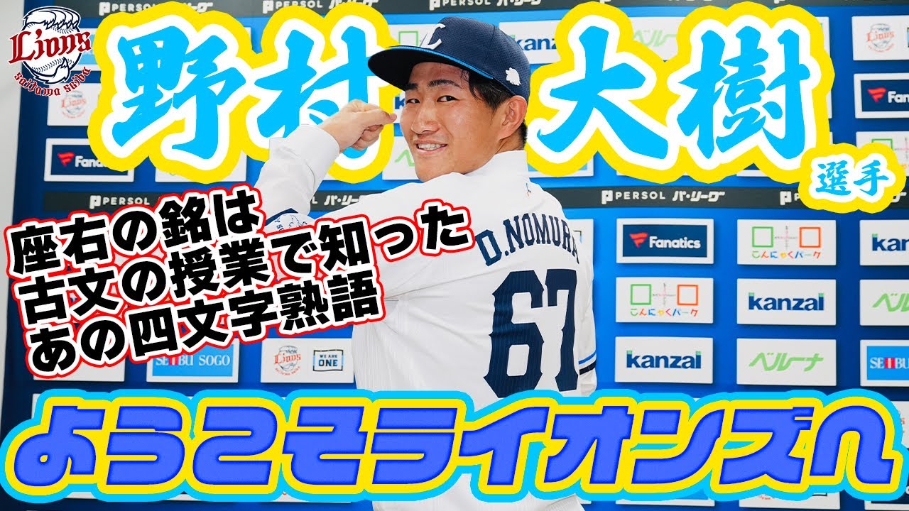の団会見を始めさせていただきますまず 始めに球団本部ネラルマネジャー県監督大 のからご挨拶させていただきますはいえお 暑い中お集まりいただきありがとうござい ますえソフトバンクホークスからトレード でえ得いたしましたえ野大選手えご報告 いたしますよろしくお願いし ますそうですねまあのライオンズさんにえ 必要とされてトレードで獲得していたて いうのは大変嬉しいですしまだここから チームが変わるんでえライオンズのために 頑張りたいという思いが強いですえ昨日の 朝 ですそうですねまやっぱり福岡に6年弱 ぐらい進んでま最近はやっと未も覚えてき てやっぱり寂しい思いもありましたけどま こっちあのその埼玉はあのなんて言うん ですかね国分寺が近くて学校が国分寺だっ たんでまちょっとはち感があるというかな ので楽しみにしてますま持ち前のやっぱり 打撃が自分の持ち味だと思ってるんでそこ のバッティングを生かして一軍で活躍 できるように頑張りたいなと思います中村 選手と本当に話してみたくてどう いう打席で心境で立っているかなど聞いて みたいなと思います自分の持ちである打撃 を生かしてチームの勝利に1点でも多く 自分が入れられるように頑張っていきたい なと思います優の目はまグローブとかにも 入れてるんですけどガシに賛っていう言葉 が好きでそうですねま高校の古文の授業で 習ってそこからグローブには絶対入れる ようにしてますお願いし ますオもちゃまちゃそうそうそうはい オッケーはいはいオッケー待ってて待って てそうですねはい はいはいありがとうござい ますはいもうスーツ下とあとネクタイも ちょっと青ではいライオンズカラーで来 ましたはい1日でも早くライオンズの ファンの人に覚えられ覚えてもらえるよう にはい青できました この辺り福岡はソフトバンクホークスから えトレードで埼玉セブラ4で行きました 野村大事です1日でも早く一軍で活躍 できるように頑張りますので応援よろしく お願いし [音楽] ますne
